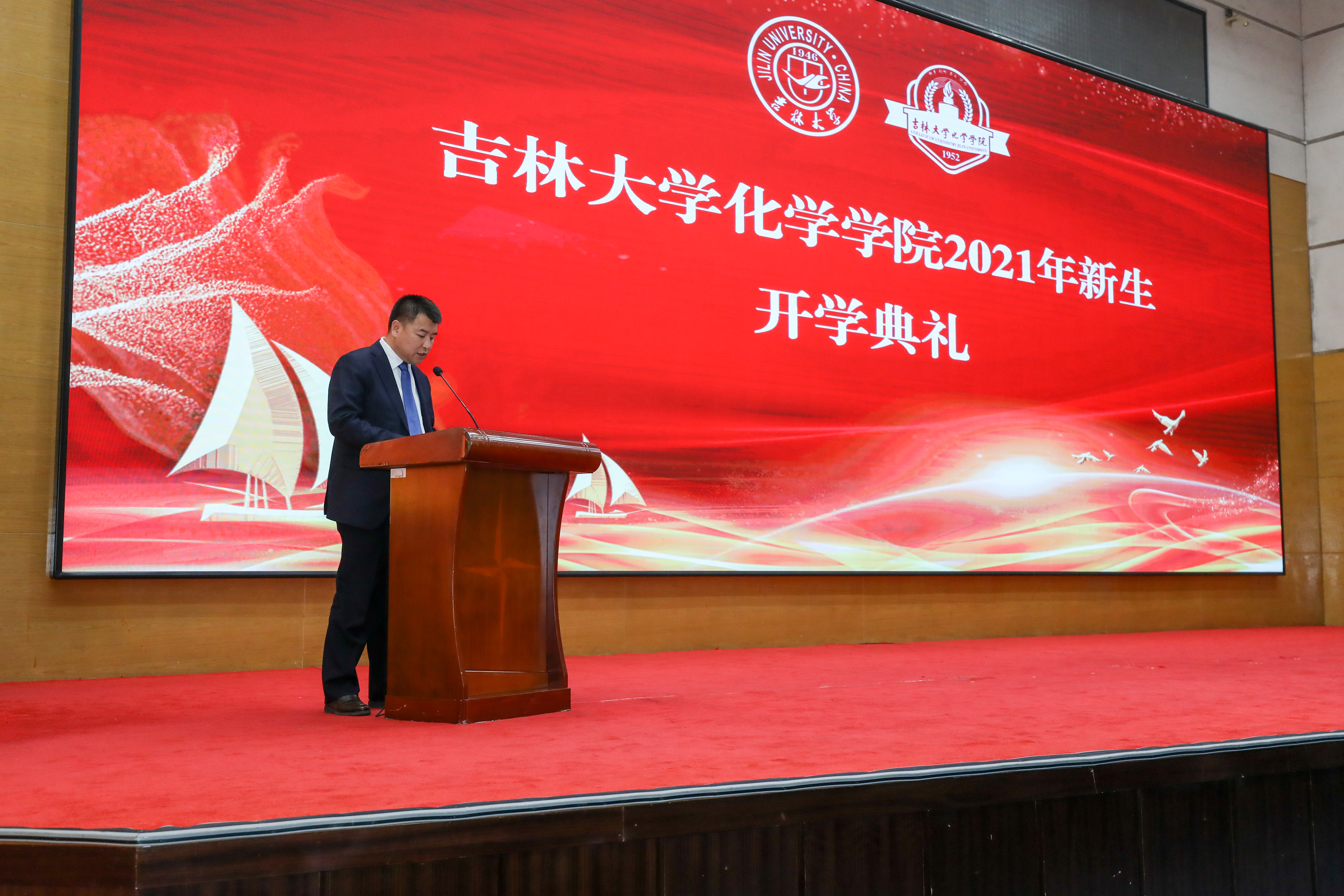 院长吕中元为典礼致辞,他对学院252位本科生新同学表示热烈的欢迎,并向始终关注学院发展建设、辛勤付出的老师和家长们致以衷心感谢。“源五湖四海,终百脉归一,你们将有一个共同的名字‘吉大化学人’”。他简单介绍了学院的建设发展情况,鼓励学生增强强国有我之志气、底气、骨气,结合学院建系元勋唐敖庆先生等老一代化学家北上建设吉大化学的故事,激励同学们要热爱伟大祖国;结合暑假期间的院长赠书,激励同学们要有跳出思维藩篱的能力,努力让“critical thinking”—也就是品判性思维成为自己的思维模式;结合我国化学科技工作者推动世界化学发展的实例,激励同学们要守正创新之道,爱上化学,学好化学,未来能够引领化学,通过当下的努力让自己成为祖国建设的有用之才、栋梁之材。