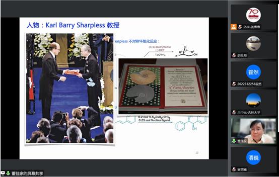 讲座中,董佳家教授围绕点击化学的发现和发展,深入浅出且幽默诙谐地介绍了 “点击化学”——模块化连接砌块分子,实现分子功能的理论本质,并对其开创了功能导向的化学时代进行了详细解读。同时分享了K. Barry Sharpless教授乐于学习、善于发现、勇于探索的科学精神以及Sharpless教授生活工作中的一些有趣的小故事。随后,董佳家教授激励广大学子,希望当代青年学者能够学习发扬老一辈化学家的科学精神,内化于心,外化于行,勇攀学术高峰。在交流互动环节,董佳家教授耐心详细地解答了院内外师生的问题,并对点击化学领域的发展做出了展望,草榴社区