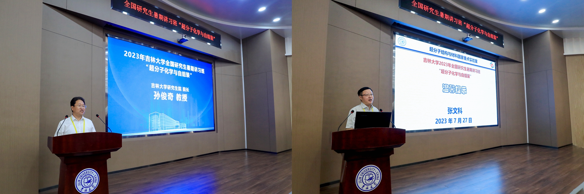 开班仪式上,研究生院院长、超分子结构与材料国家重点实验室主任孙俊奇代表组委会致辞,介绍了本次讲习班作为“东北六校”联合举办的重要学术交流活动之一的背景意义,并鼓励学员们不断开拓创新。超分子结构与材料国家重点实验室副主任张文科介绍了讲习班期间学员日常安排、校园基本情况,强调了学员纪律及相关安全要求。