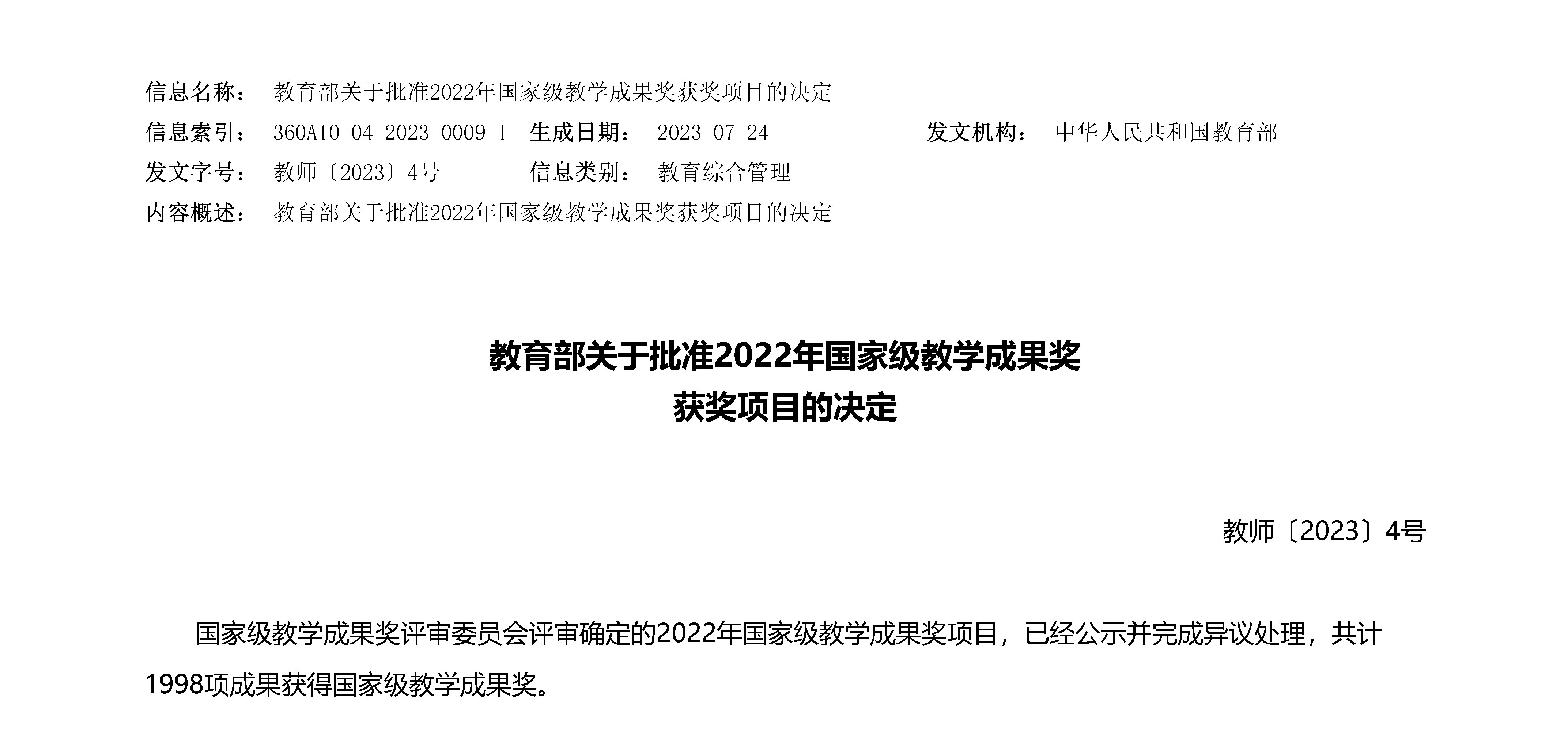 近日,《教育部关于批准2022年国家级教学成果奖获奖项目的决定》(教师〔2023〕4号)公布。草榴社区