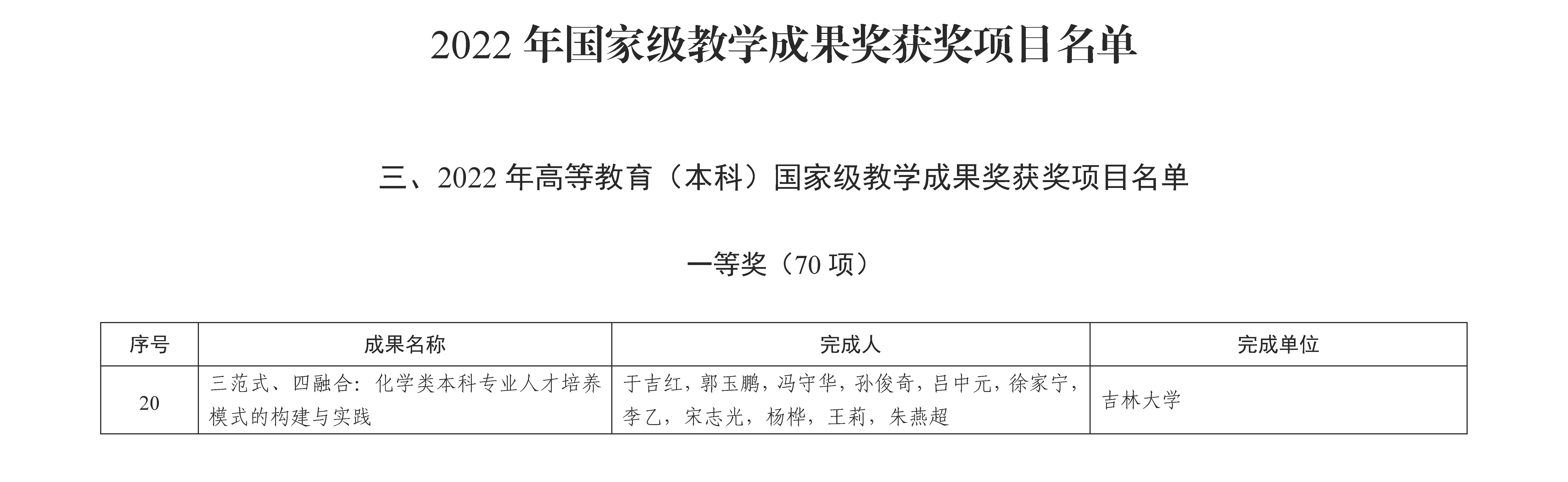 于吉红、郭玉鹏、冯守华、孙俊奇、吕中元、徐家宁、李乙、宋志光、杨桦、王莉、朱燕超完成的《三范式、四融合:化学类本科专业人才培养模式的构建与实践》教学成果,荣获2022年高等教育(本科)国家级教学成果奖一等奖。这是70项2022年高等教育(本科)国家级教学成果奖一等奖中唯一一项化学专业相关的教学成果,也是我院继1993年《物理化学学科建设与人才培养》获国家级优秀教学成果一等奖以来再次荣获国家级教学成果奖一等奖。