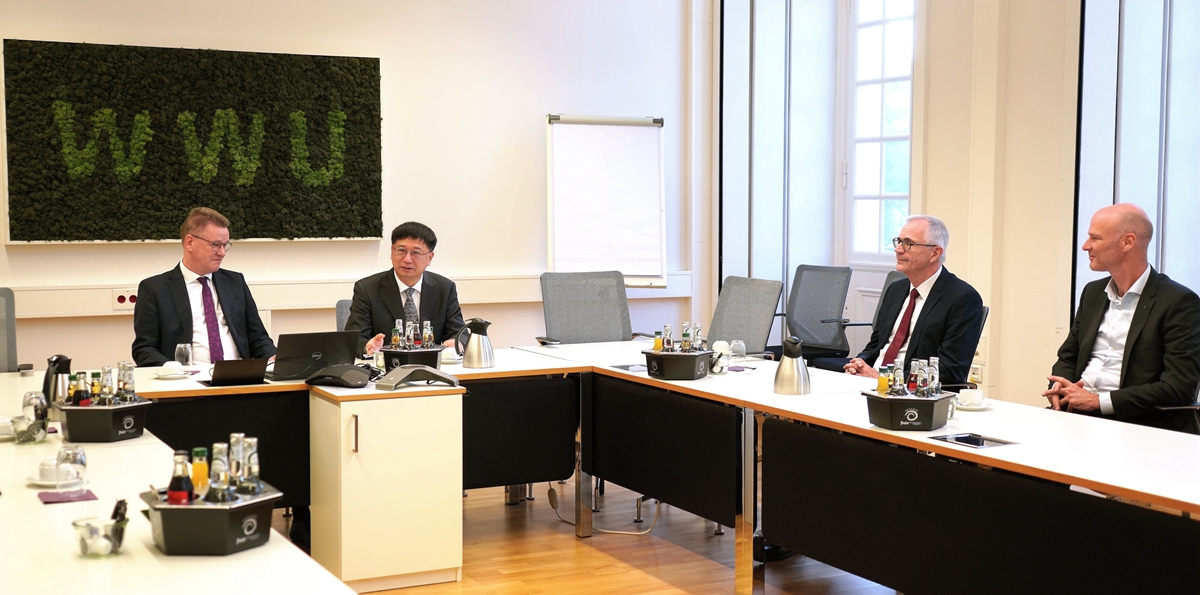 和明斯特大学都是综合性大学,在化学、物理、数学、生命科学、地学、哲学、法学、医学、人兽共患病等领域具有巨大合作空间。韦塞尔斯向代表团简要介绍了明斯特大学近年来的办学进展,特别是学校的科研重点领域、卓越集群建设情况、创新创业与校企融合进展等,高度肯定两校在化学、物理等领域的务实合作,并对开展更多领域合作做出积极回应。双方就继续组织双边研讨会、推动博士研究生联合培养、共同推进前沿科学探索与交叉融合研究等达成了共识。