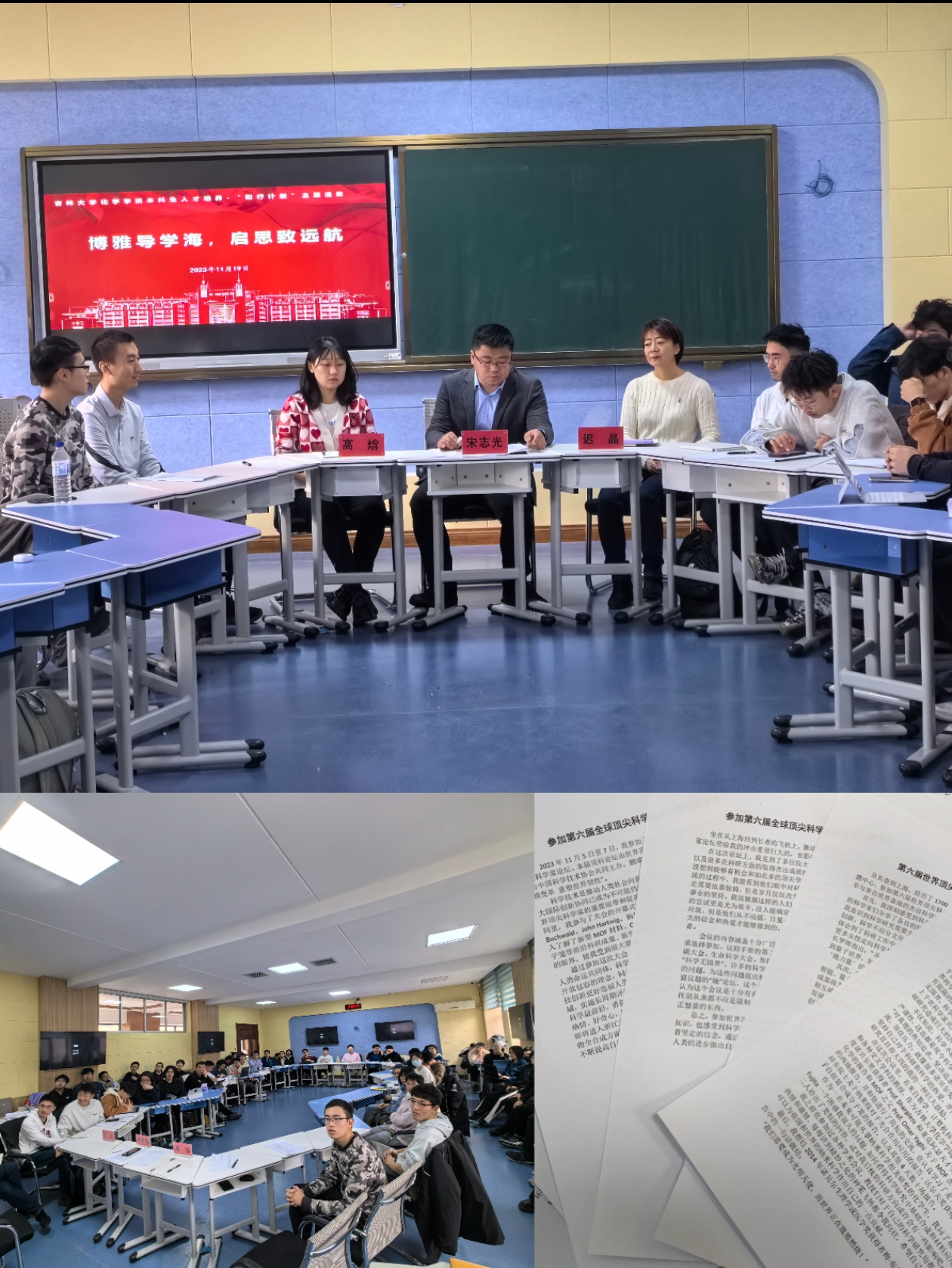 随后,2023年暑期以来赴名古屋大学进行国际交流,赴南开大学参加第七届全国化学类专业大学生科技交流会、赴上海参加世界顶尖科学家论坛的杨智博等7名同学,分别围绕交流访学和参会期间的所见、所闻、所感同现场的同学进行了交流。
