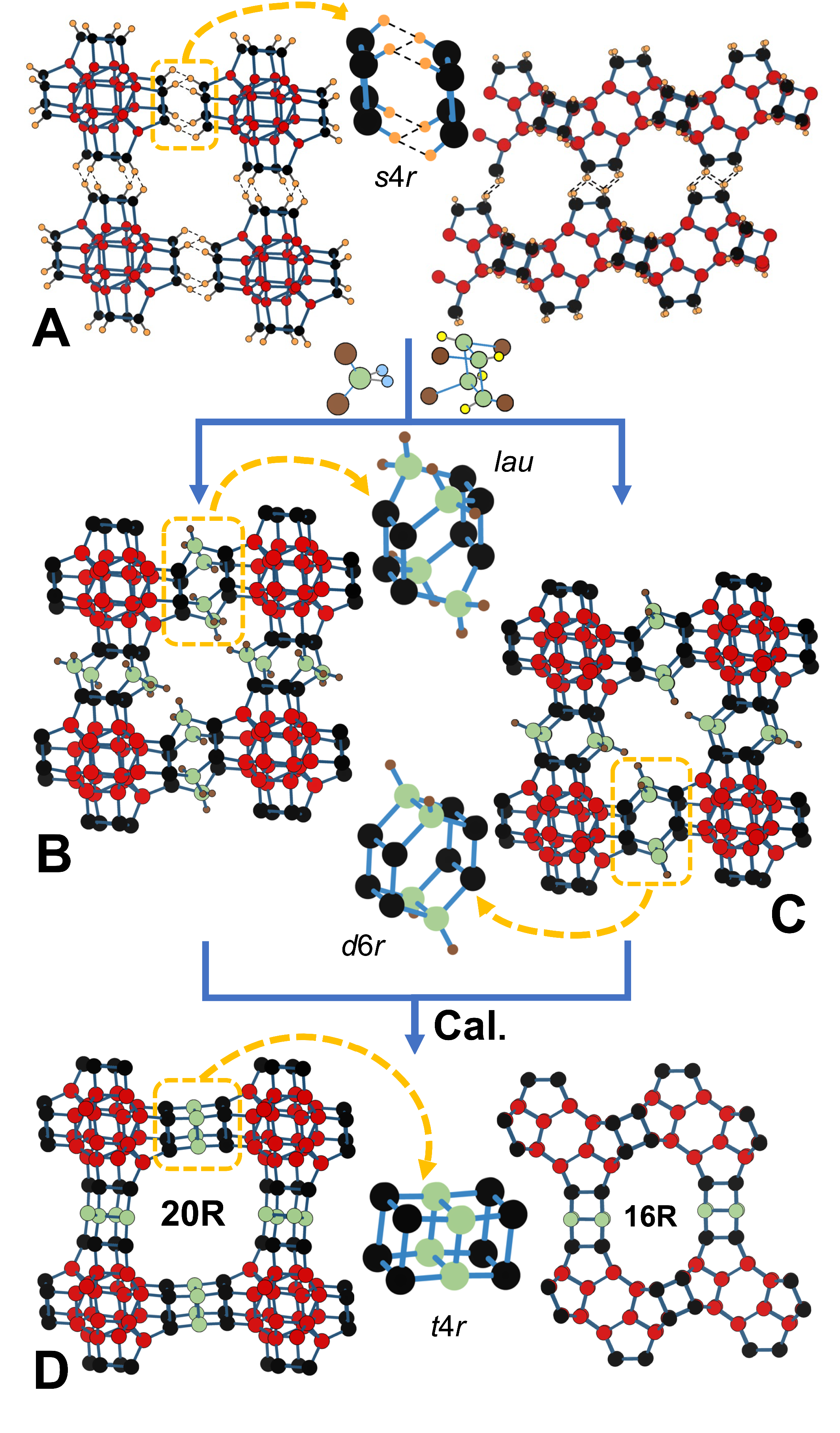 研究团队在前期ZEO-2的链状硅酸盐材料的基础上,通过链间扩展反应,插入硅烷化试剂,产生了新的沸石结构。硅烷化试剂可以是二氯二甲基硅烷(DCDMS)或四甲基环四硅氧烷(TMCTS)。根据使用的硅烷化试剂的不同,链间新插入的硅原子化学环境有较大差别,分别生成了中间体ZEO-4A或ZEO-4B,两者都保留了ZEO-2的针状形态,虽然具有名义上的20×16×16环超大孔道结构,但并不是全连接的稳定分子筛。ZEO-4A中的DCDMS硅源导致每个Si含有两个甲基基团,并通过氧桥连接两个ZEO-2链的单四元环,同时保留了两个甲基基团,形成了lau结构单元;而在ZEO-4B中,TMCTS每个Si只有一个甲基基团,TMCTS分子中的单四元环发生断键,并通过氧桥连接ZEO-2链的单四元环,生成了不同于ZEO-4A的双六元环d6r结构单元。