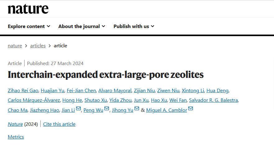 、无机合成与制备化学国家重点实验室于吉红院士和陈飞剑教授联合西班牙马德里材料研究所、华东师范大学、南京大学等单位的科研人员在Nature期刊上发表了题为“Interchain-expanded extra-large-pore zeolites”的研究工作。该工作报道了通过链间扩展法成功合成一例具有20×16×16元环孔道系统的三维稳定超大孔分子筛ZEO-5。基于团队前期发现的一维链状硅酸盐分子筛前驱体ZEO-2向三维超大孔分子筛ZEO-3(分子筛结构代码:JZT)的拓扑缩合结构转化机理(Science,2023,379, 283-287)的基础上,进一步在ZEO-2的链间插入硅烷化试剂,通过煅烧拓扑转化后得到了孔径更大的超大孔分子筛ZEO-5。相比于ZEO-3的16×14×14元环的孔道结构,ZEO-5具有20×16×16元环孔道系统,成为三维稳定超大孔分子筛最大孔道的又一个新的记录。这是团队自2021年12月报道的首例三维超大孔硅铝分子筛ZEO-1(分子筛结构代码:JZO)以来(Science,2021,374,1605-1608),三年内在三维稳定超大孔分子筛研究中所发表的第三篇正刊。
