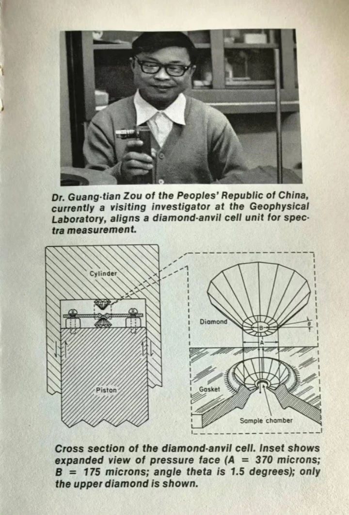1980年2月,经过考试,我被派往美国学习高压科学与技术。我联系了美国华盛顿-卡内基研究院地球物理实验室的毛河光博士。美国华盛顿-卡内基研究院是美国钢铁大王卡内基于1902年建立的纯学术研究机构,总部设在华盛顿,5个实验室分布在美国各地。当时,该研究院的院长埃伯特是生物学家,美国国家科学院副院长。地球物理实验室有12名常聘研究员,其中有2名美国科学院院士,他们每位都是自己领域的顶尖科学家。我按照他们的要求,写了一个关于地幔物质高压研究的实验计划,经该实验室5位专家评审通过,于是就到了该实验室做访问学者。到美国之后,我就按照研究计划,用以毛河光和彼得•贝尔命名的Mao-Bell金刚石对顶压砧,进行了氧化亚铁的高压X光衍射实验。我在国内没有做过这种实验。我花了一周时间,在毛河光的指导下组装金刚石对顶砧,调试两个金刚石砧面要绝对平行。实验开始一个多月,就发现了一条X光衍射谱线增宽,再加压后,谱线发生劈裂。同时,我也测量了高压下氧化亚铁的穆斯堡尔谱,发现了由顺磁的双峰,逐渐变成4个吸收峰,最后变成了6个吸收峰的反铁磁相。这是首次发现地幔模型矿物氧化亚铁的结构和磁性的相变,为研究地球内部结构研究提供了一个全新的结果。