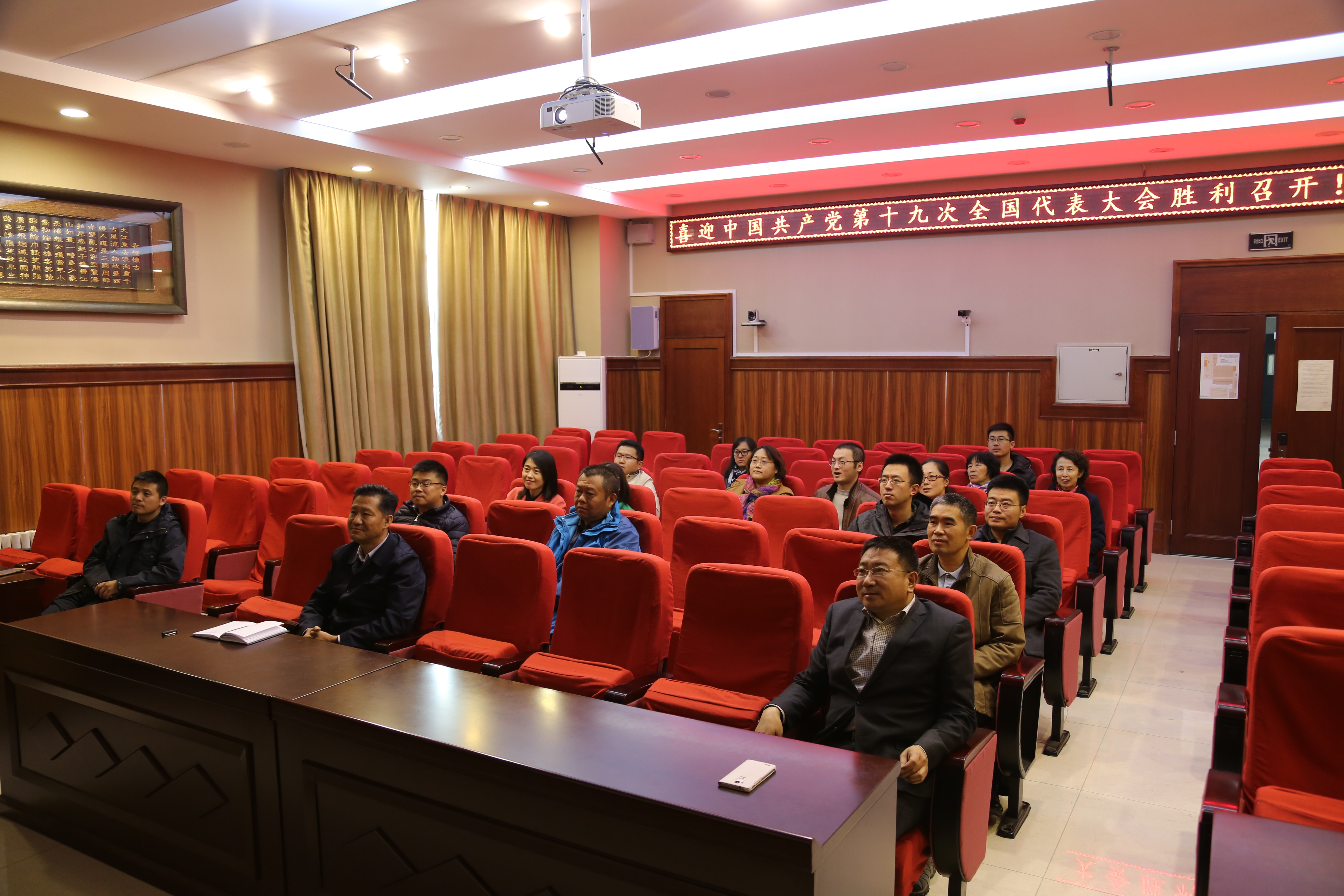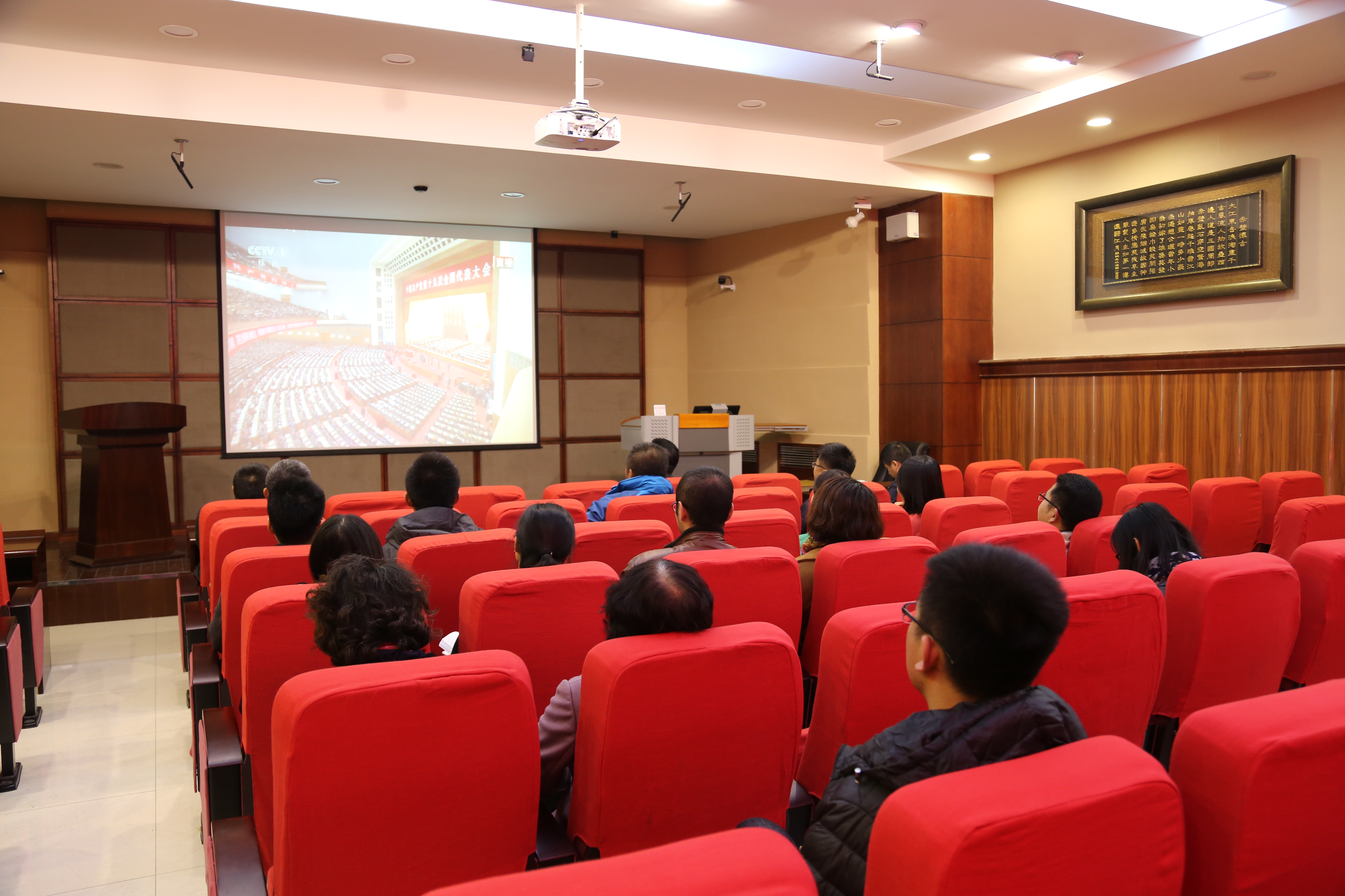 党委组织各党支部书记及全体行政人员于唐敖庆楼A408会议室集体收看开幕式,与会人员认真聆听习近平总书记作的《中国共产党第十九次全国代表大会报告》,伴随报告进行会议室内不时响起阵阵掌声。因工作原因未能参加集中收看的同志则利用广播或互联网收听收看开幕会。