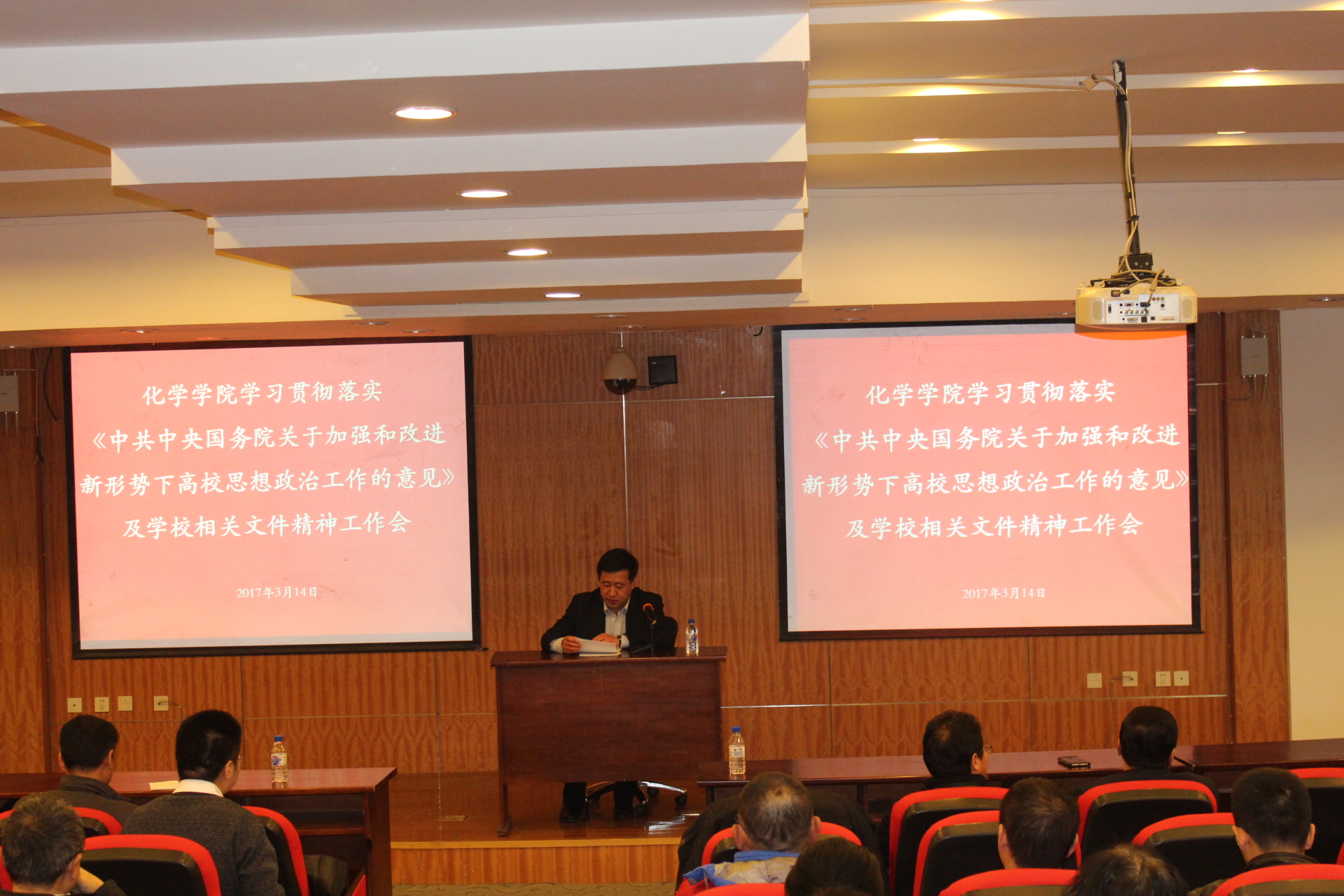 在无机超分子楼一楼圆形报告厅召开全院教职工大会,专题学习贯彻落实《中共中央国务院关于加强和改进新形势下高校思想政治工作的意见》及学校相关文件精神。会议由学院党委副书记兼副院长、纪委书记李勇主持。