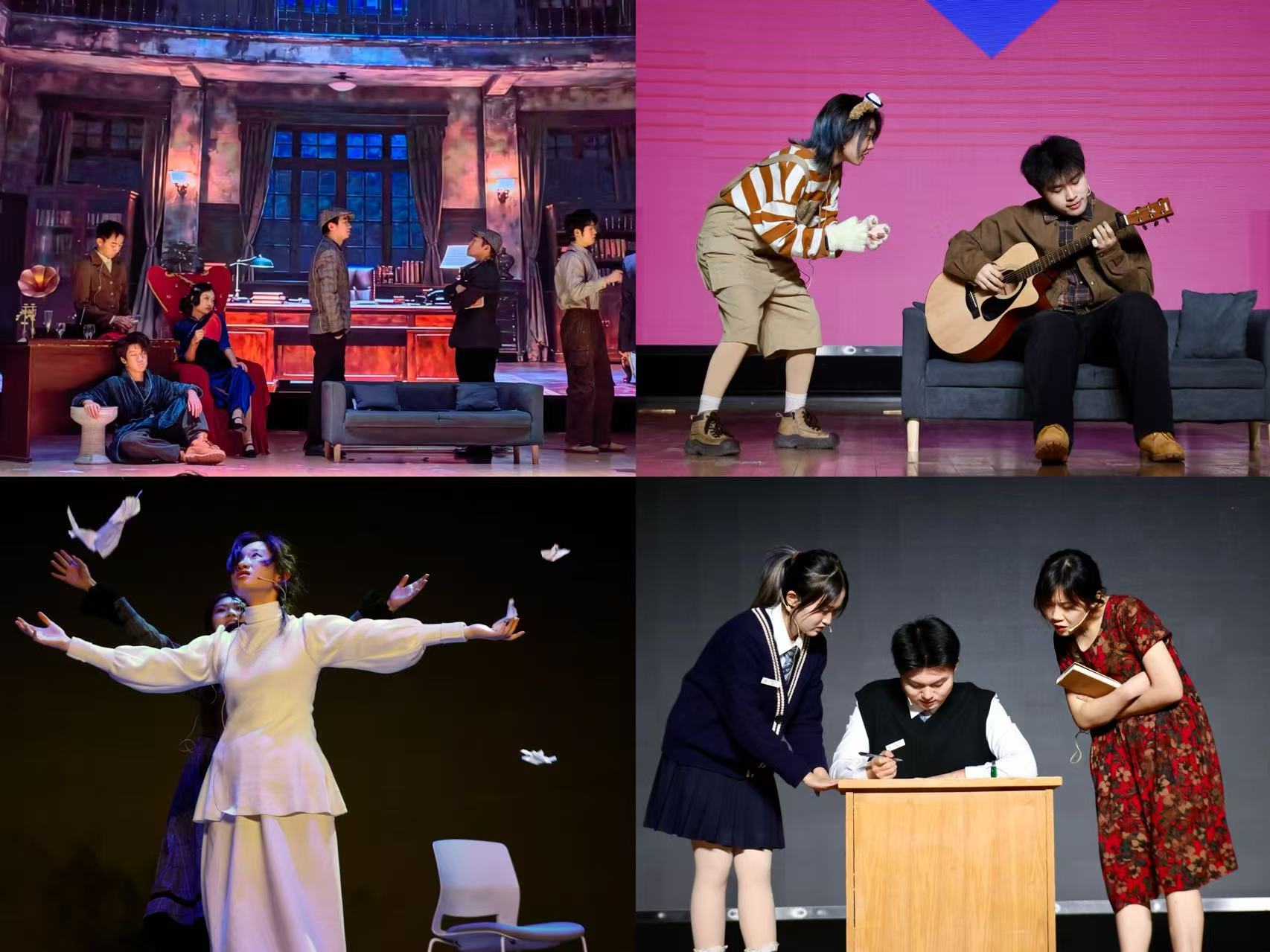 本届戏剧节改编自《心上人儿》《莫奈的光影》《当考试还剩15分钟》《周日之谜》四部短剧,由来自20余个学院的50余名学生共同创作与演出。作品涵盖情感、成长与自我管理等多重维度,以舞台为镜,生动映照出大学生活的现实状况与内心图景,既捕捉日常中的欢笑与困扰,也传递出在自省与表达中寻找成长、凝聚共情的涵义。