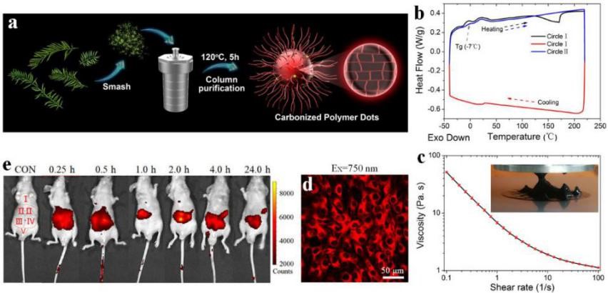 图: 深红光发射的CPDs的合成、聚合特性及生物成像应用a) 合成示意图,b) DSC曲线,c) 粘度分析,d) 双光子细胞成像,e) 活体成像