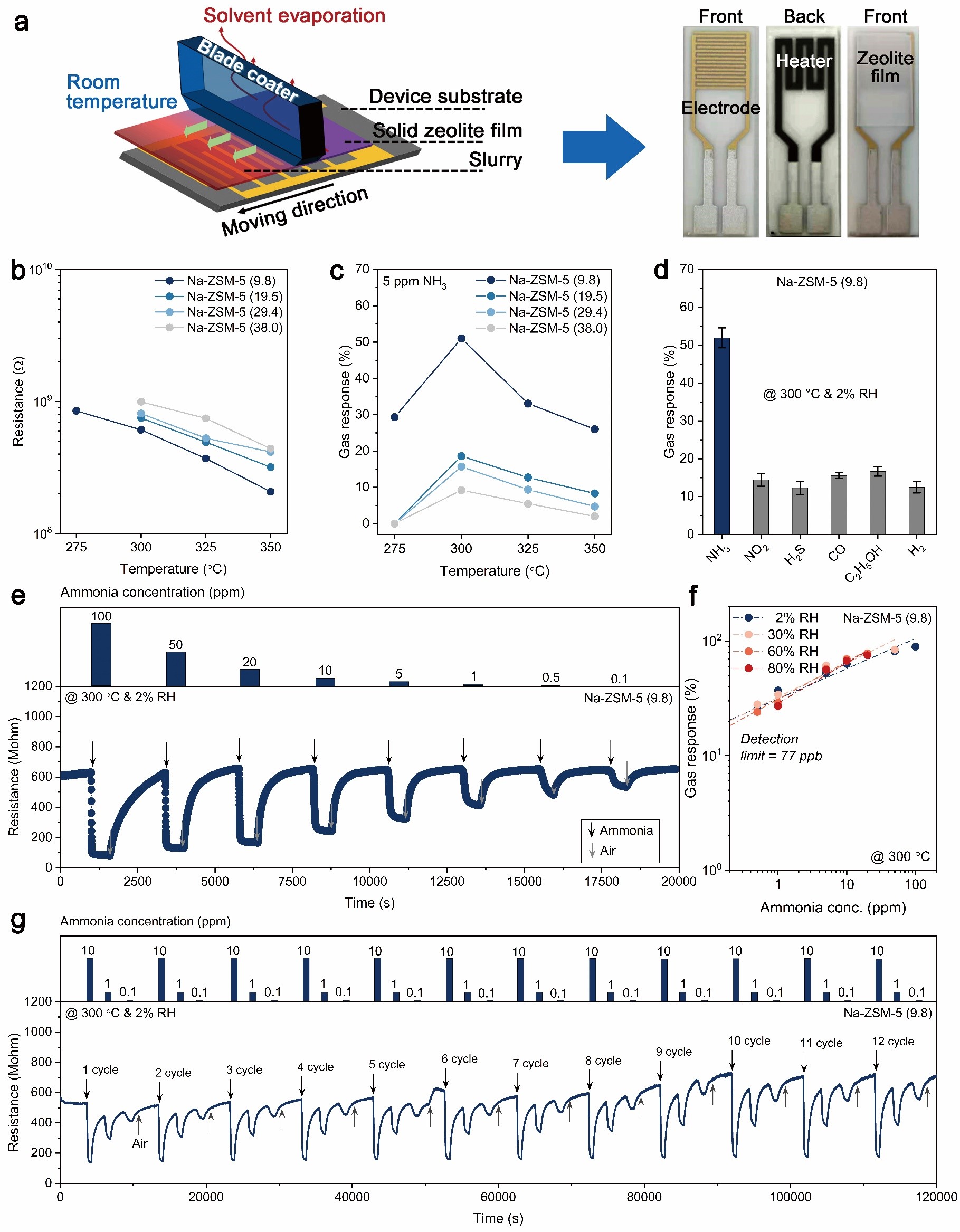 图三:分子筛基电阻式气体传感器的(a)制作流程示意图;(b,c)基线电阻、灵敏度与温度的关系图;(d)选择性测试;(e,f)不同湿度下氨气浓度梯度测试;(g)循环稳定性测试