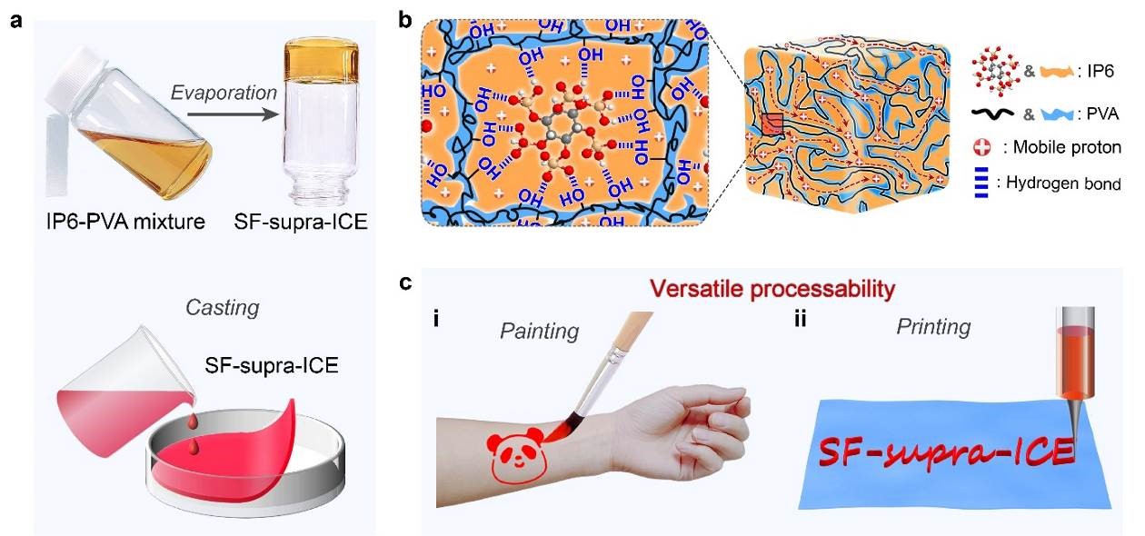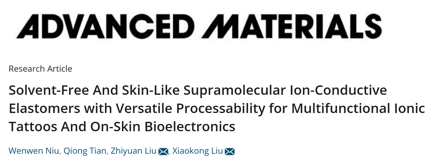 刘小孔教授课题组和深圳先进院刘志远研究员合作提出了超分子封装的理念,利用生物相容性的PVA通过高密度氢键交联对可电离的天然无毒小分子IP6进行封装,发展了兼具服役稳定性与生物安全性的无溶剂超分子离子导电弹性体(solvent-free supramolecular ion-conductive elastomer,SF-supra-ICE)。该弹性体的室温离子电导率高达3.3×10-2S m-1,具有类似皮肤的柔韧性、回弹性和应变诱导硬化特性,同时还具有高透明度、透气性、自粘附性。SF-supra-ICE的制备极为简便,仅由前驱体水溶液经一步自发的水蒸发过程即可得到,可进行多样化的加工成型。将SF-supra-ICE的前驱体溶液作为墨水,通过涂抹、绘制、打印等方式可在人体皮肤上构筑个性化的“离子纹身(I-tattoos)”,进而构建多功能的皮肤电子器件,用于人体电生理信号采集监测、人机交互、精准诊疗等领域。该工作以题为“Solvent-Free and Skin-Like Supramolecular Ion-Conductive Elastomers with Versatile Processability for Multifunctional Ionic Tattoos and on-Skin Bioelectronics”的文章发表于Advanced Materials上。