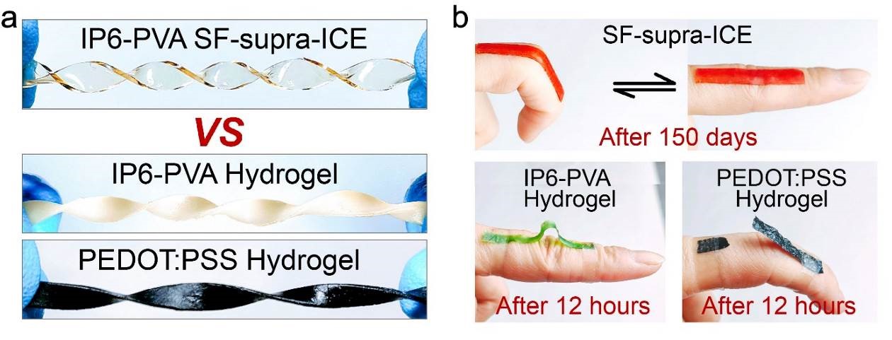 SF-supra-ICE与水凝胶基可拉伸导体的稳定性对比