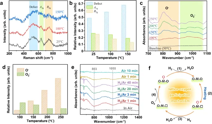图:动态反应过程研究。利用原位拉曼光谱和原位DRIFTS分析了Ge-SnO2在不同温度和不同气氛下的表面状态变化,揭示了晶格氧在氢气传感反应中的动态转化过程。