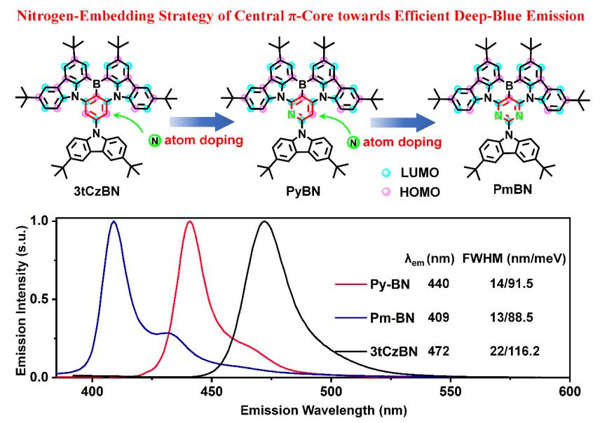 氮原子嵌入策略实现高效率、窄光谱深蓝有机发光二极管的示意图。