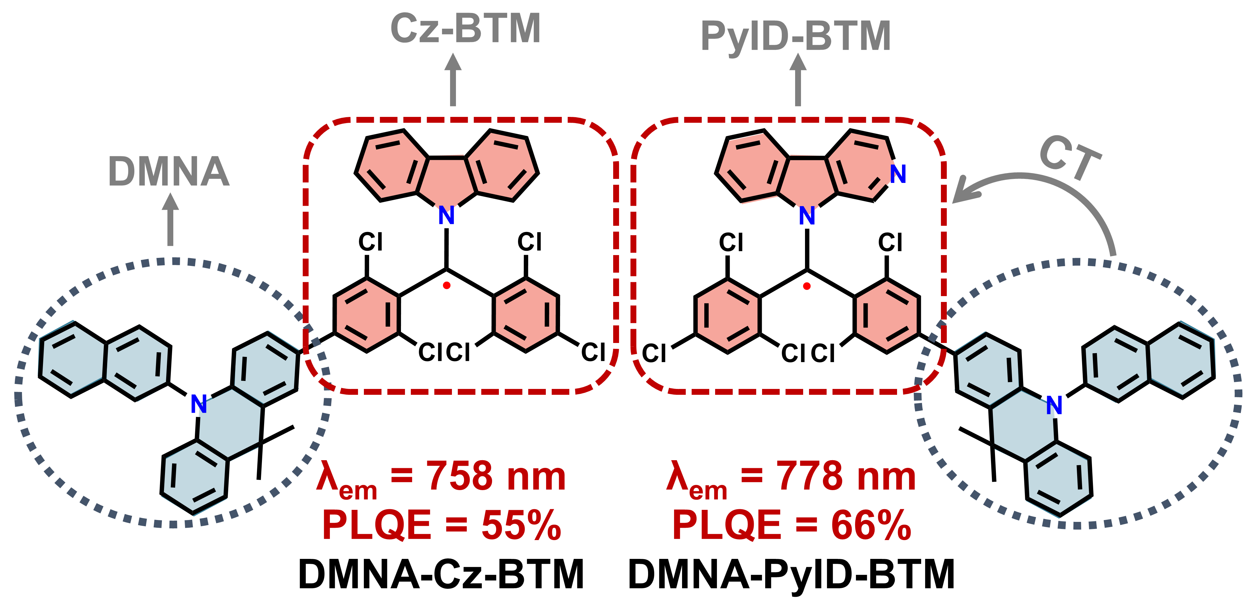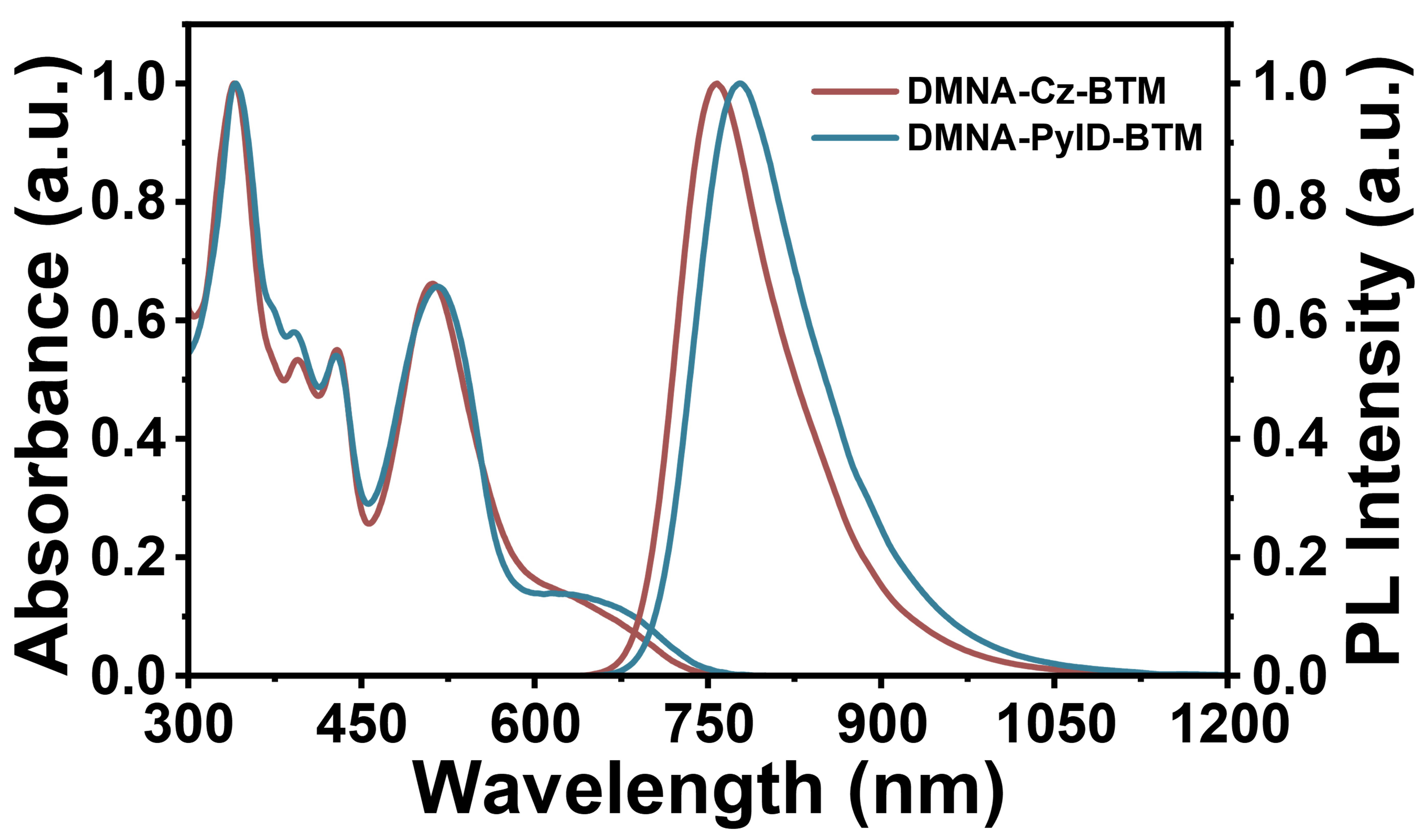李峰教授团队报道了二苯甲基自由基Cz-BTM和PyID-BTM。这一发光自由基体系的单电子占据分子轨道(SOMO)的电子云均匀分布在整个自由基分子骨架上。基于这一性质,李峰教授团队通过将一个强给电子基团DMNA引入Cz-BTM和PyID-BTM,设计合成了发射峰值波长超过750nm的高效近红外发光自由基DMNA-Cz-BTM和DMNA-PyID-BTM。