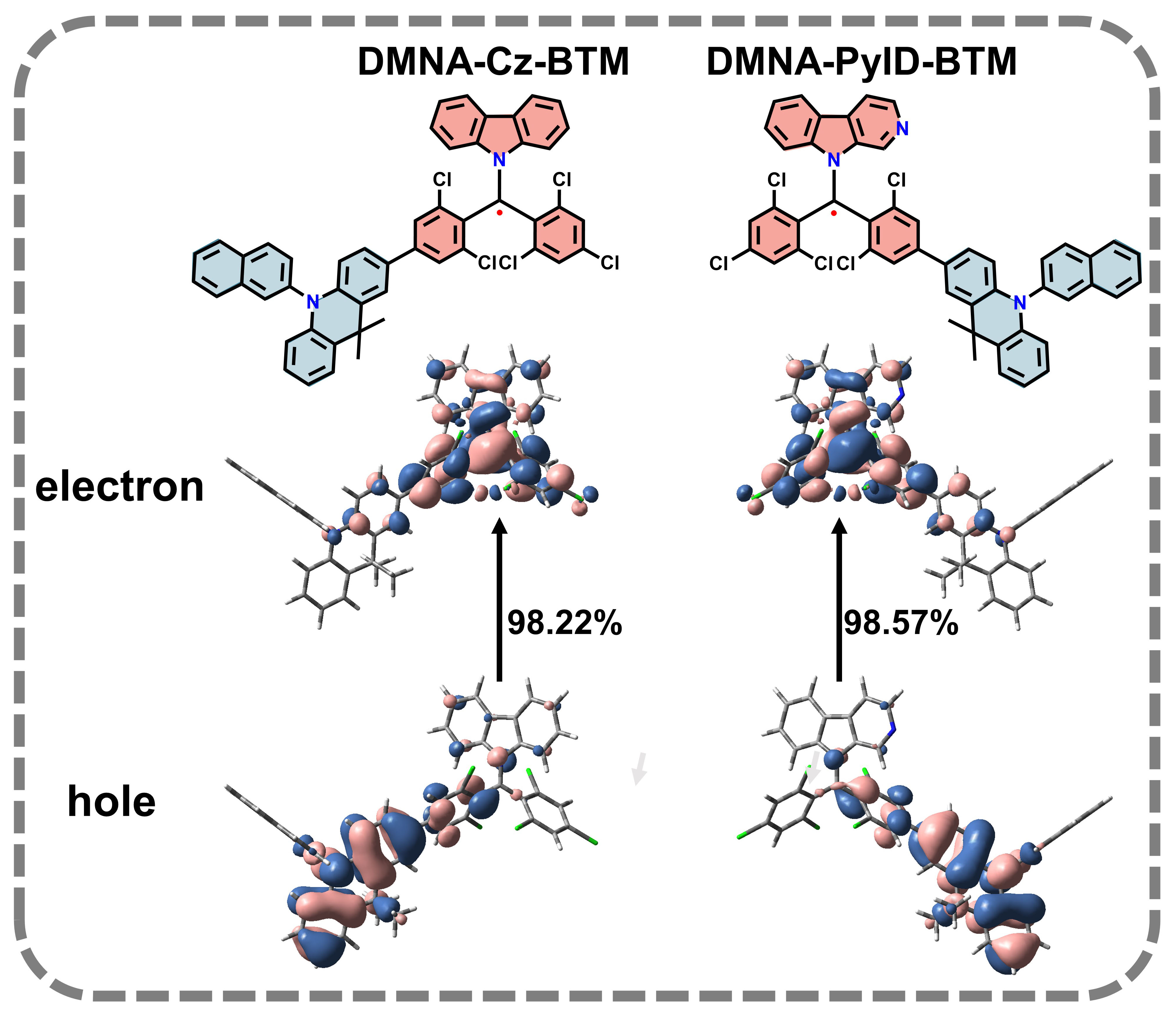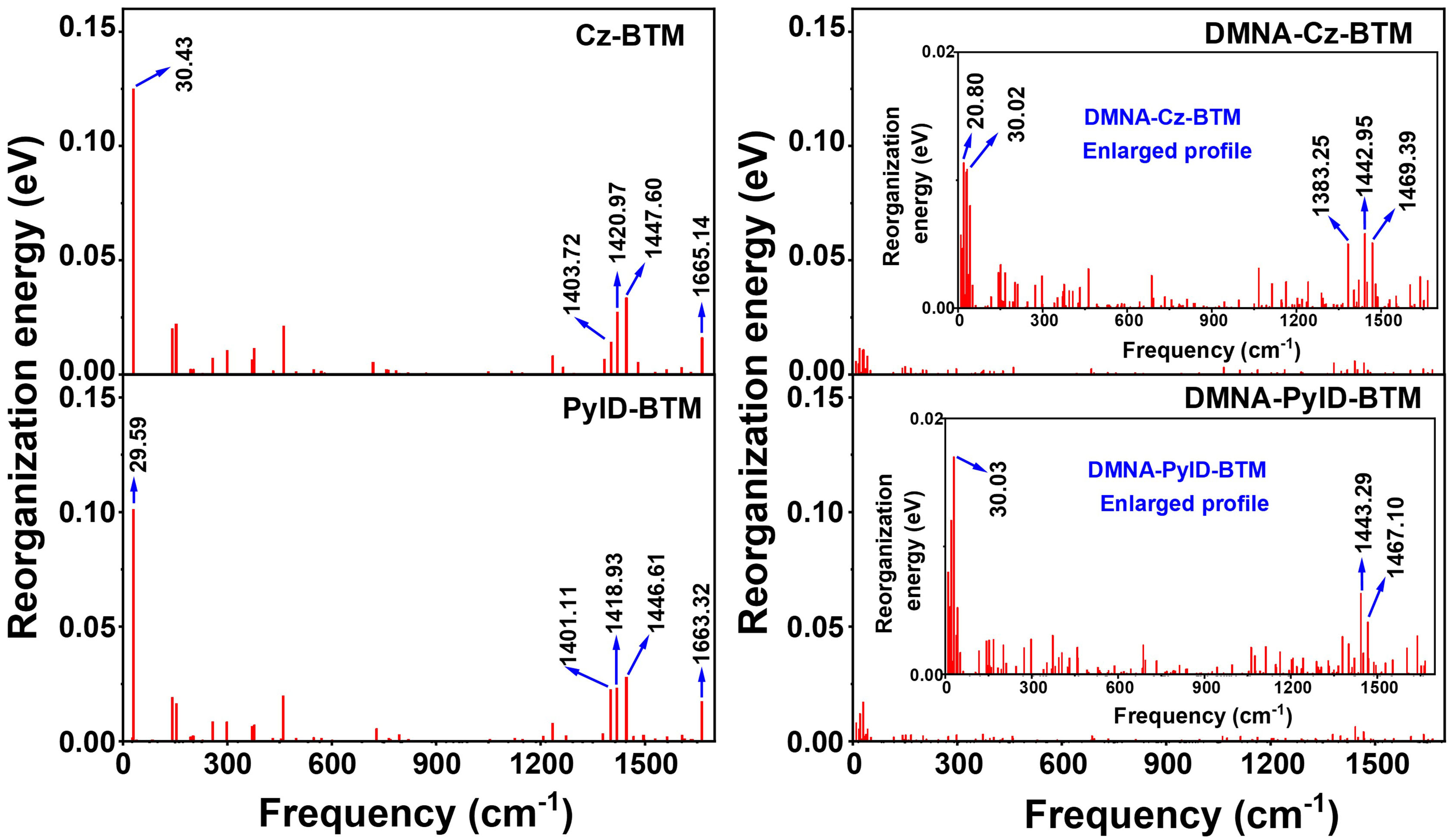 自然跃迁轨道(NTO)计算结果显示,DMNA-Cz-BTM和DMNA-PyID-BTM的第一激发双线态为电荷转移态且电子和空穴是空间分离的。此外,其电子和空穴分布具有非成键轨道特征。这使得DMNA-Cz-BTM和DMNA-PyID-BTM的高频振动(1380 cm-1~1700 cm-1)相对于Cz-BTM和PyID-BTM得到了有效抑制。