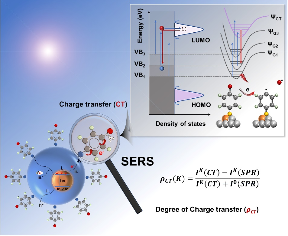 宋薇教授课题组通过MOF衍生技术制备了掺杂有不同含量铜离子的氧化锌纳米颗粒(ZnO@CuOx-y),兼具优异的表面增强拉曼散射(SERS) 性能和光催化活性,为SERS在半导体界面电荷转移(CT)过程研究中的应用提供了合适的平台。该研究首次从分子指纹光谱的角度揭示了半导体光催化活性和界面电荷转移度的关系,相关成果以“Putting Charge Transfer Degree as a Bridge Connecting Surface-Enhanced Raman Spectroscopy and Photocatalysis”为题,于1月29号发表在Angew.Chem. In. Ed.上。