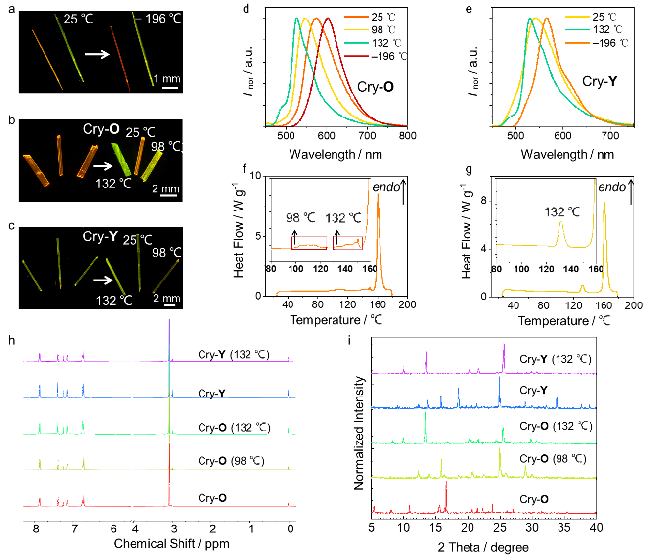 当Cry-O和Cry-Y晶体在365 nm激发下从室温(25°C)冷却到液氮温度(-196°C)时,观察到明显的荧光红移(图2a)。Cry-O的发射峰由575 nm红移至605 nm(图2d),而Cry-Y的发射峰由540 nm红移至566 nm(图2e)。单晶衍射数据证实晶胞单元压缩是导致发射峰红移的原因。当Cry-O加热到98℃时,其荧光从橙色变为黄色(图2b),最大发射波长从575 nm移动到546 nm(图2d)。进一步将Cry-O加热至132°C,会引起第二次从黄色到绿色的转变,发射峰从546 nm变为526 nm(图2d)。对于Cry-Y,从25°C加热到98°C导致荧光强度下降(图2c),进一步加热至132℃后,Cry-Y的荧光颜色由黄色变为绿色,最大发射波长由540 nm变为530 nm(图2e)。冷却至室温后,两种晶体的荧光都保持稳定,这表明Cry-O和Cry-Y的相变是单向且不可逆的。