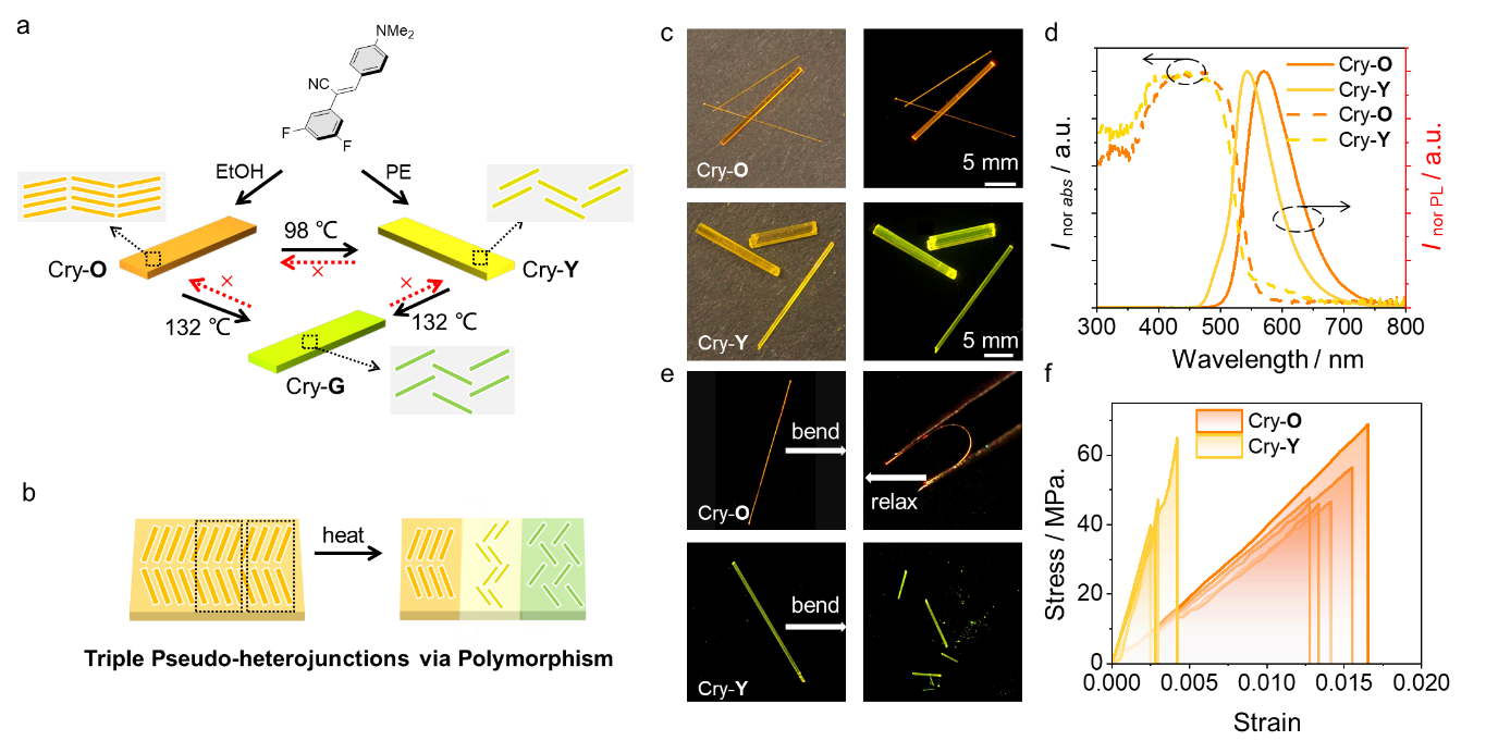 图1. DPDAPA不同晶相的生长与转变(a)和三元伪异质结晶体的制备过程(b)示意图;Cry-O与Cry-Y晶体的吸收发射光谱(c, d)与机械性能测试(e, f)