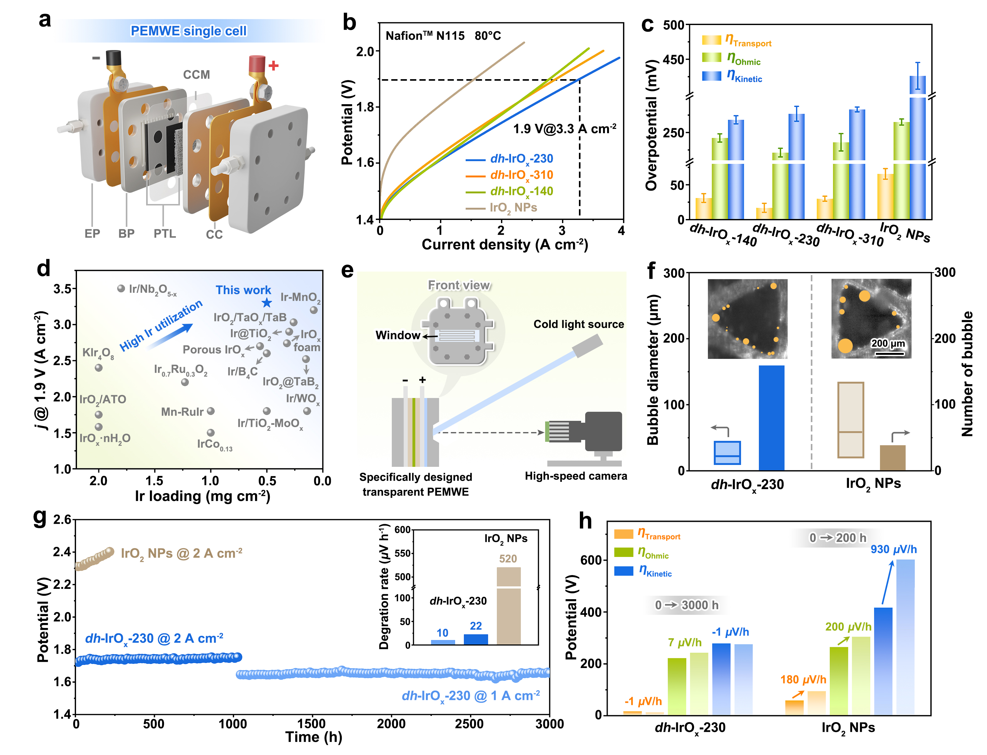 图3.dh-IrOx的PEMWE电解槽性能