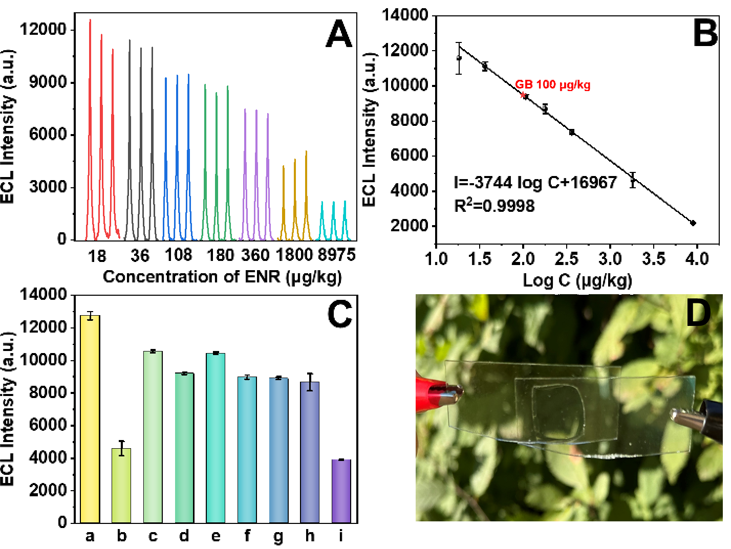 基于PAMES水凝胶构建的ECL传感体系用于对牛奶样本中ENR的高灵敏检测(见图4),可以定量检测18μg/kg到8975μg/kg的ENR,且选择性和重现性良好,为食品中抗生素残留检测提供了新策略,有望在食品安全检测领域得到广泛应用。