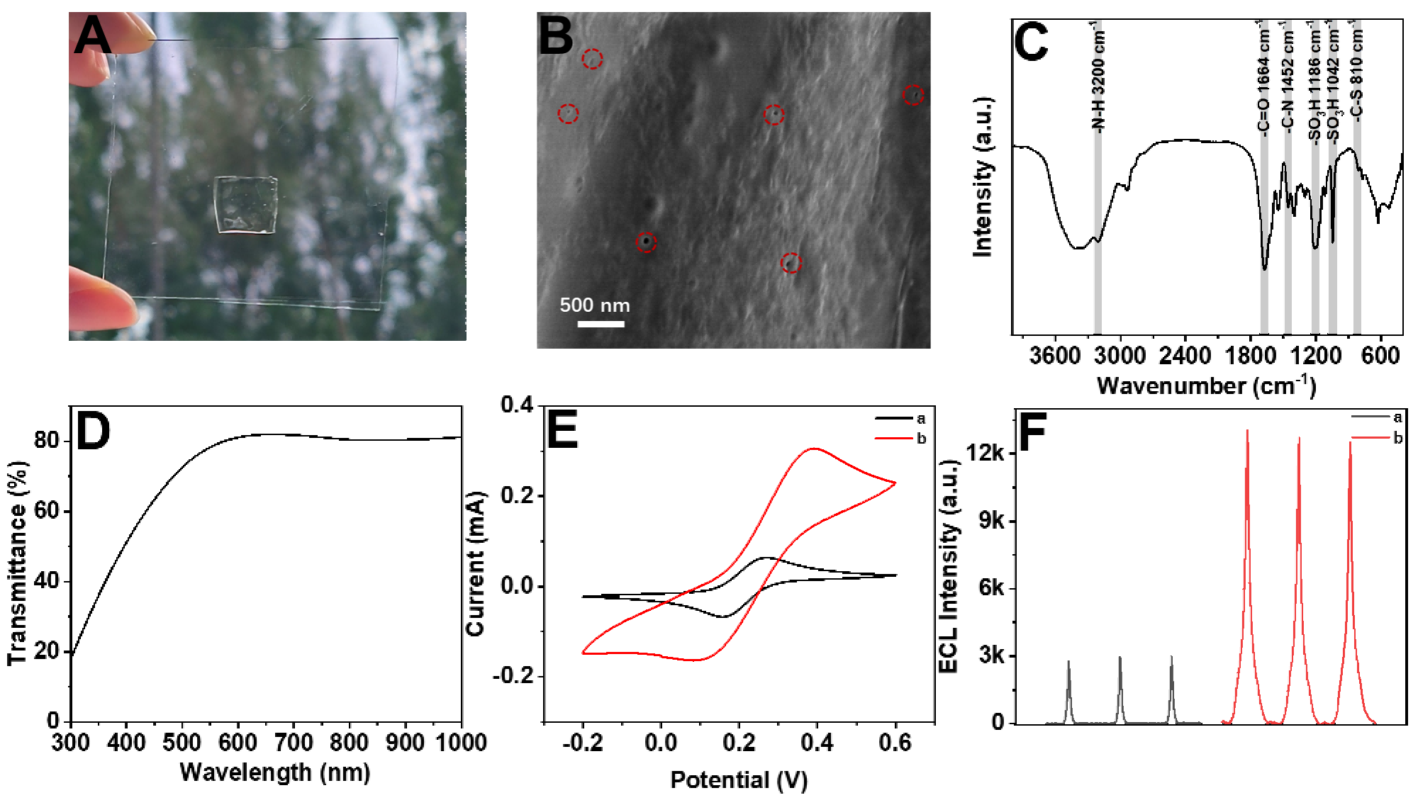 所制备的PAMES水凝胶性能表征如图3所示。作为传感体系中的准固态电解质,PAMES水凝胶体系具有三维介孔结构和高比表面积,PAMES中的AMPS单体具有强吸水性,为离子迁移和ECL产生提供了有利的环境。另一方面,导电性PEDOT:PSS的加入显著提升了水凝胶离子电导率。同时,PAMES水凝胶的酰胺基团能够作为催化活性位点,吸附共反应剂以提升电化学反应效率,显著增强了(5-AT-co-CA)-N-dots的传感信号。