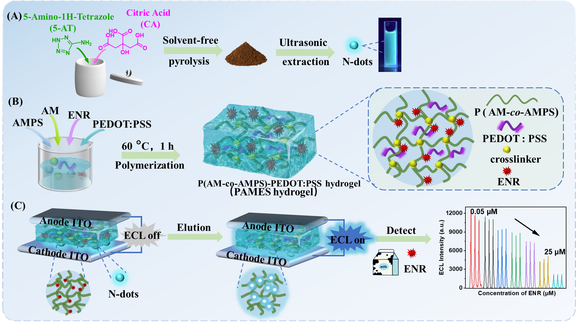 马强教授课题组开发了一种水凝胶基准固态电解质的电化学发光(ECL)传感器用于检测牛奶中的恩诺沙星(ENR)。研究制备P(AM-co-AMPS)-PEDOT:PSS水凝胶(PAMES)作为准固态电解质,PAMES水凝胶具有较好的离子电导率、粘附性、透明度和含水量。水凝胶基准固态电解质的传感系统克服了传统液体电解质的性能限制,提高了传感器的应用性、便携性和环境适应性,实现了对食品中残留抗生素的成功检测。研究成果以“Quasi-solid hydrogel electrolyte/nitrogen dot-based electrochemiluminescence sensor for enrofloxacin detection in milk”为题,于3月12号发表在Food Chemistry期刊(doi.org/10.1016/j.foodchem.2025.143890)。