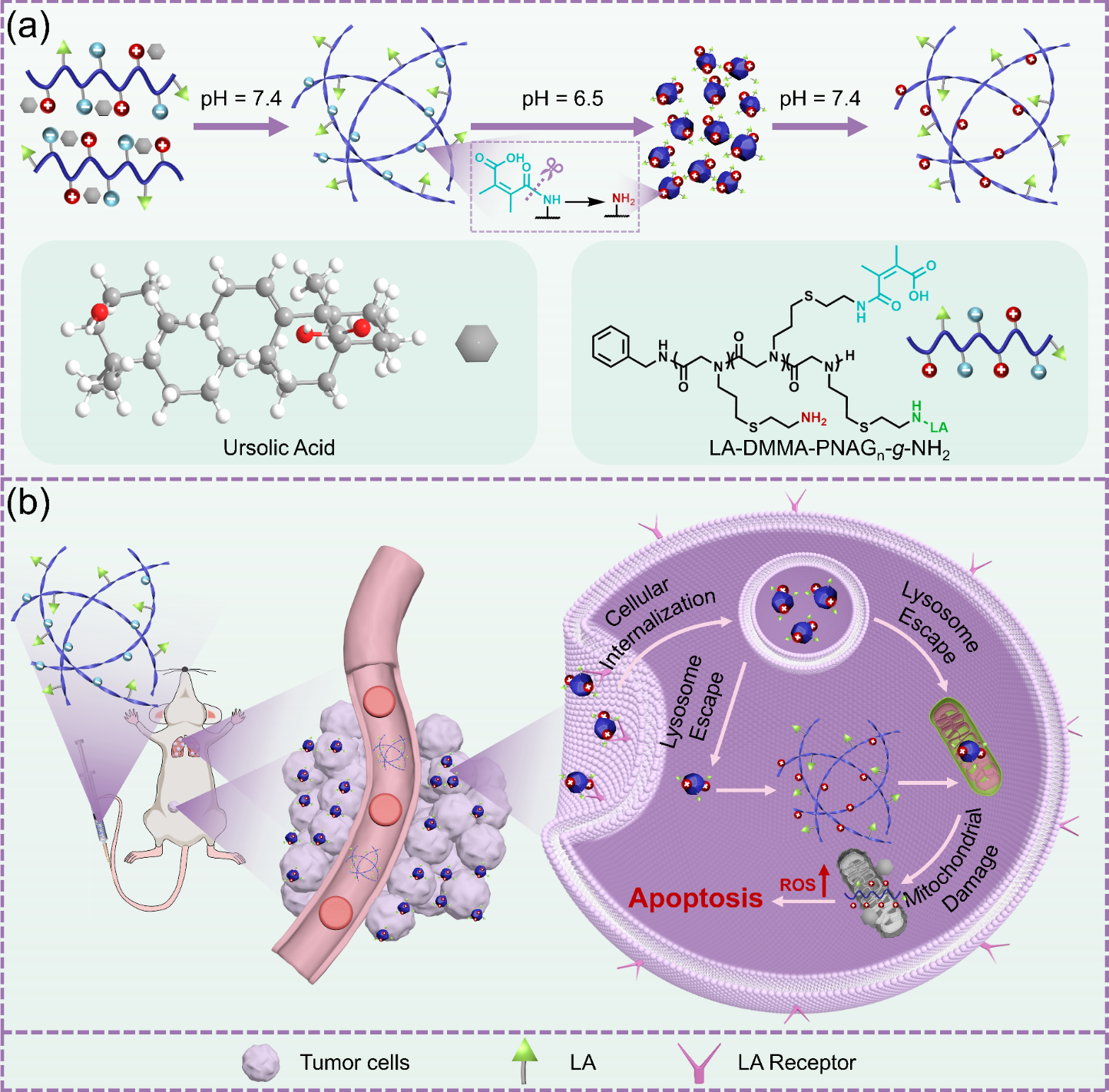 本研究通过分子设计在系统中引入酸响应基团和靶向配体,实现了UA在肿瘤微环境(TME)中的精准递送。研究表明,该纳米系统具有独特的结构转换特性:在中性条件下保持稳定的螺旋纳米纤维形态,而在酸性TME中则可逆转变为病毒样纳米颗粒,这种形态转变显著增强了药物在肿瘤组织中的渗透能力。