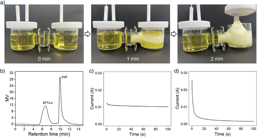作者结合实验与DFT计算,揭示了阳离子自由基引发机制的核心作用:1)循环伏安和差分脉冲伏安实验证实硫辛酸单体在阳极经历了吸附控制的单电子氧化过程(n = 1.04);2)DFT计算显示1,2-二硫戊环中S原子具有最高的电子云密度(Fukui函数值0.340),在氧化过程中优先失去电子形成高活性阳离子自由基TASS·+(图2a);3)脉冲动力学实验证明该聚合反应为硫自由基主导的链增长模式,XPS检测到末端锍鎓基团的特征峰(166.5eV),最终经双分子耦合终止形成线性聚合物(图2b-c)。该机理通过流变学线性特征(无橡胶平台区)及阴离子无关性实验得到进一步验证。