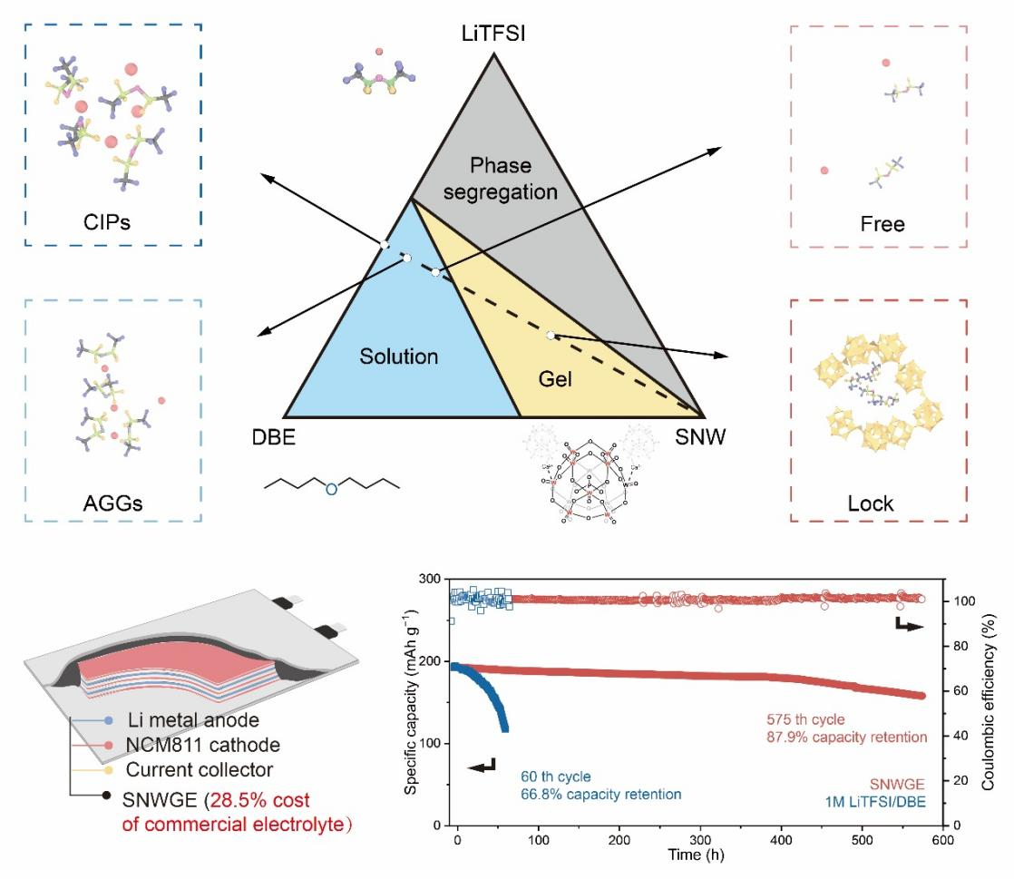 针对上述难题,徐吉静教授团队提出“分子锁定”策略:在低极性醚类电解质中引入钙基多金属氧酸盐亚纳米线,构筑了具有三维连续网络的凝胶电解质(SNWGE)。该电解质对低极性醚溶剂与阴离子实施空间限域和静电束缚,抑制其挥发与渗漏,同时促进锂盐解离,使锂离子迁移数提升至0.73;在25°C下离子电导率达1.26 mS·cm−1,并将电化学窗口拓宽至5.0V。基于SNWGE的Li||NCM811全电池的能量密度达380 Whkg−1,670次循环后容量保持率为88.5%;在过充至8 V时电池温度保持在50 °C以下,并能在钉刺/挤压等极端工况下稳定供电。机理上,电极界面原位生成的无机富集、薄而高模量的界面层(锂负极端杨氏模量≈13.4 GPa,NCM811正极侧厚度≈1.5 nm),显著降低了极化并抑制副反应。得益于原料廉价与工艺简洁,SNWGE成本仅为商用锂离子电解液的28.5%(约$ 60.4 kg−1),同时实现了高性能、高安全和低成本,具备良好的产业化前景。