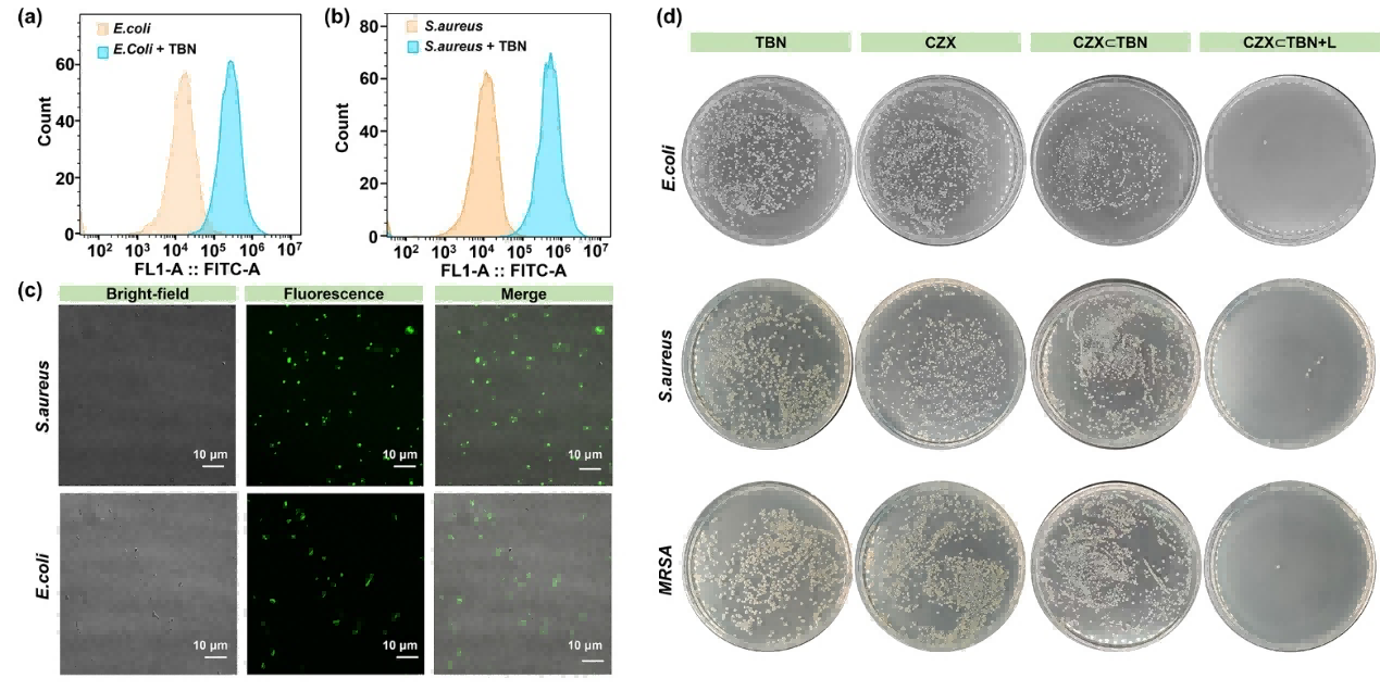 优异的性能最终需要在实际应用中得到验证。图3所示的抗菌实验结果展现了大环分子TBN在成像与治疗一体化方面的巨大潜力。流式细胞分析和荧光显微成像首先证实了TBN可以靶向并标记细菌(如大肠杆菌和金黄色葡萄球菌)。随后,作者将TBN与抗生素头孢唑肟钠(CZX)联合使用。在光照下,该复合物对多种细菌(包括耐药菌MRSA)都展现出显著的抑菌和清除效果,其最低抑菌浓度在光照下显著降低,菌落几乎被完全清除。这种高效抗菌活性源于TBN的生物膜破坏作用、光动力产生活性氧与抗生素化学杀菌之间的协同效应,为应对耐药菌感染提供了新策略。