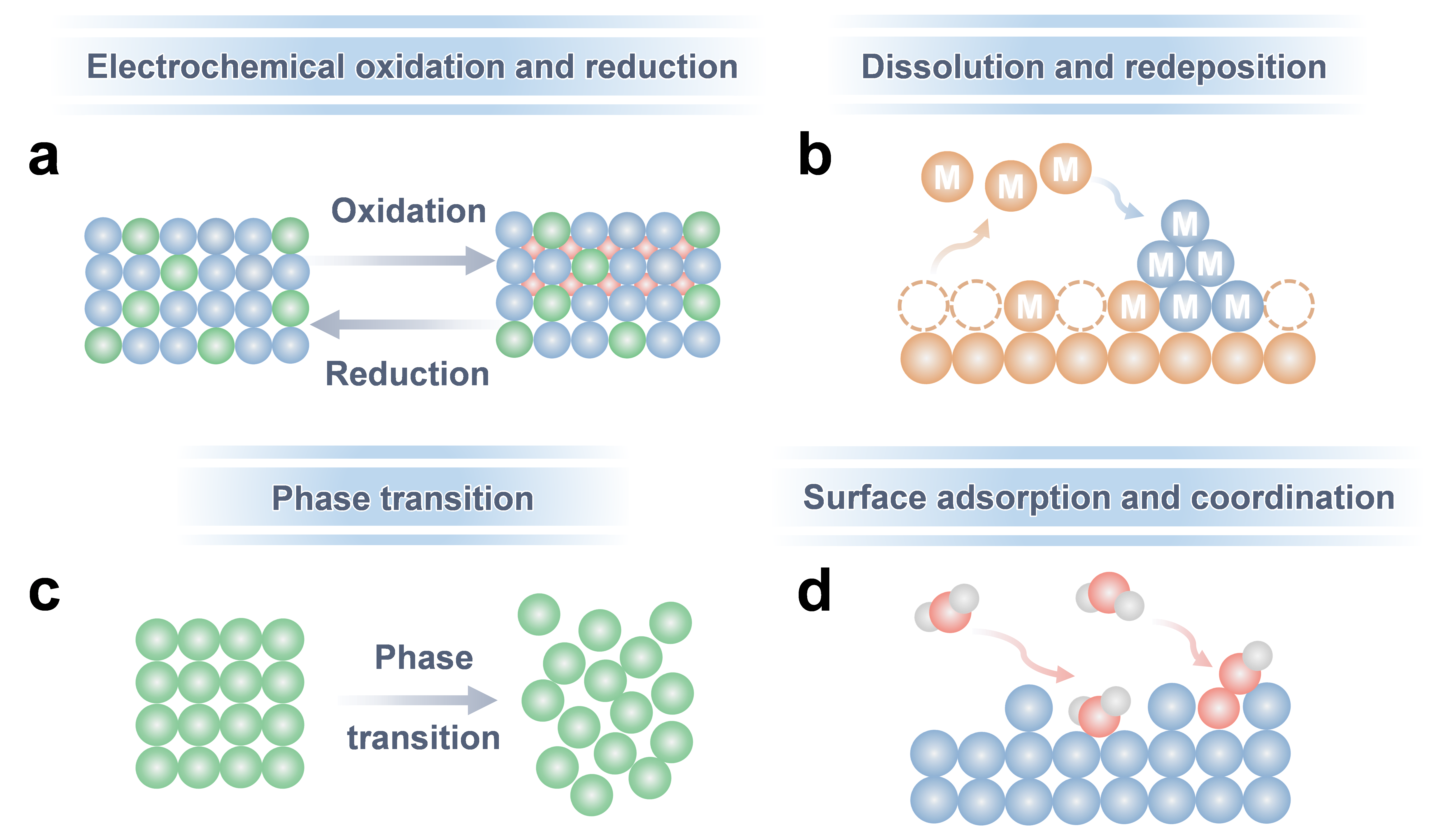 本文首先概述析氧反应(OER)、二氧化碳还原反应(CO2RR)、析氢反应(HER)等关键催化反应中观察到的重构过程(图1)。研究表明,大多数重构会引发不可逆的结构转变;然而,在某些情况下,表面重构可能具有可逆性,即当外加电势或其他外部驱动力撤除后,表面结构可恢复至初始状态。文章进一步总结了影响重构动力学及其后续催化行为的多种因素,包括外部条件(如电势、电解质环境和温度)以及内部特征(如化学组分、晶体结构和结晶度)。论文将电催化剂的重构路径归纳为四大类型(图2),涵盖了原子重排的主要方式:电化学氧化还原、溶解-再沉积、晶相转变以及表面吸附-配位。