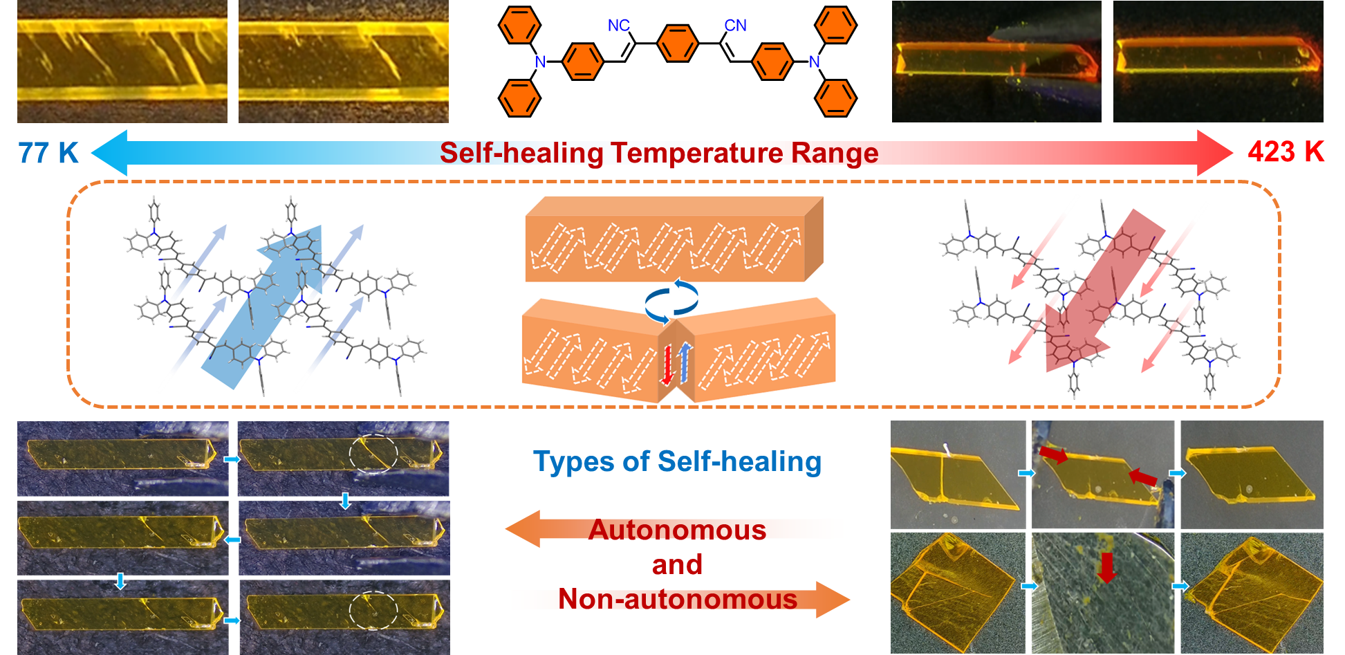 针对极端低温环境导致材料脆化、损伤加剧的严峻挑战,研究报道了一种具有给受体化学结构特征的宽温域可自修复新型有机晶体材料,并提出了自主型与非自主型两种修复模式。当裂缝较小时,晶体可在外力解除后瞬时或渐进完成自愈,称为自主型修复;若裂缝间距过大,则需外力辅助使界面靠近,称为非自主型修复。其自愈机制源于晶体独特的分子排列,晶体结构显示其呈D–π–A–π–D极性结构,层内分子有序排列,相邻层分子反向取向,形成强烈的偶极-偶极相互作用,产生静电吸引力,驱动断裂界面重新结合。该类有机晶体材料兼具优异的自愈能力与良好的光学传输特性,在极端环境光通信、光子器件及光学系统等领域中展现出广阔的应用前景。该研究也为未来新一代自修复光学材料的设计与开发奠定了重要基础。