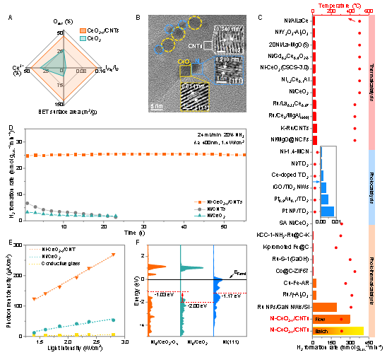 A)CeO2-x/CNTs和CeO2的催化剂特点总结;B)Ni-CeO2-x/CNTs的HRTEM图;C)本工作和其他具有代表性催化剂的产氢速率总结(热催化:红色;光催化:蓝色;光热催化:橙色);D)Ni-CeO2 -x/CNTs、Ni/CeO2和Ni/CNTs的耐久性测试;E)Ni-CeO2 -x/CNTs、Ni/CeO2和Ni/CNTs的光强依赖性光电流测量;F)Ni8/CeO2_OV、Ni8/CeO2和Ni(111)的态密度(红色虚线表示d带中心的位置)。