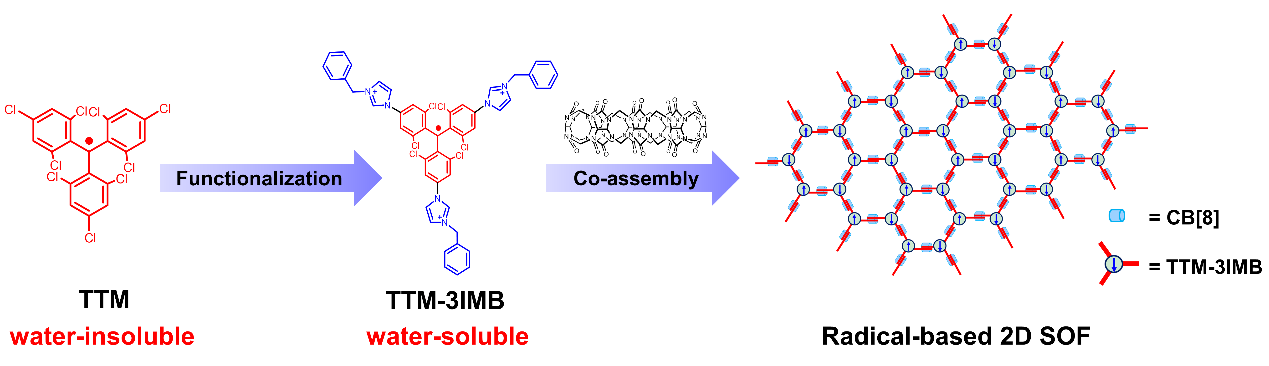 图1.水溶性TTM-3IMB及其与CB[8]构筑二维发光自由基SOF的示意图