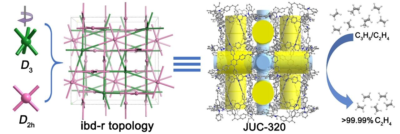 由于乙烯(C2H4)和丙烯(C3H6)动力学直径十分接近,且理化性质高度相似,二者的高效分离一直以来是工业应用中的关键挑战。C2H4和C3H6均为烯烃。三维共价有机框架(Covalent Organic Frameworks, COFs)的非极性孔隙环境能够减弱气体与框架之间的相互作用,从而促进动力学分离,可能更有利烯烃分子的分离。但由于结构拓扑和孔隙特征的有限多样性,精心设计和合成三维共价有机框架(3D COF)以实现高效的气体分离仍然是一个巨大的挑战。