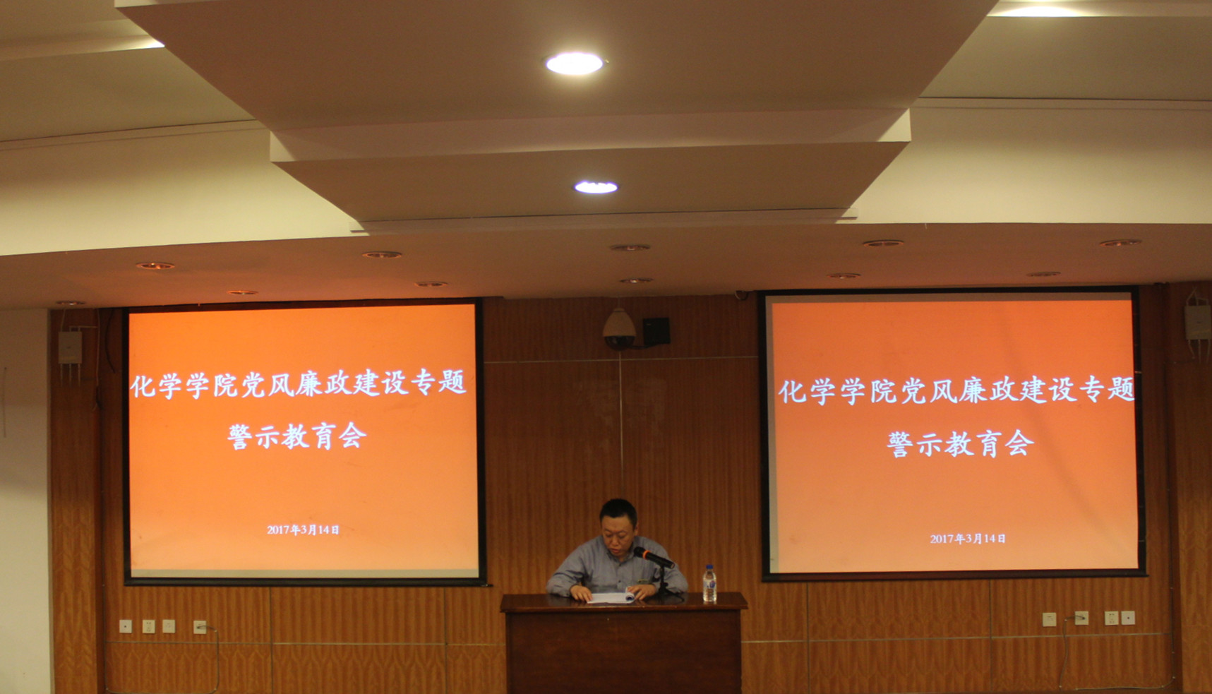 2017年3月14日下午,草榴社区 在无机超分子楼一楼圆形报告厅召开党风廉政建设专题警示教育会。会议由学院党委书记丁世海主持。