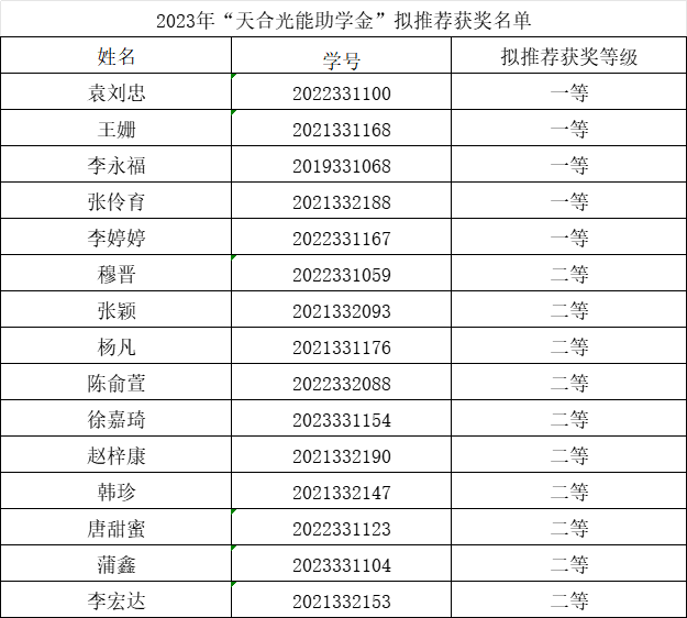 按照草榴社区 2023年“天合光能助学金”评选工作安排,经研究生申报、研办审核、专家评选,拟推荐获奖名单公示如下,如有异议请与赵晓杰老师联系,联系电话13504470223。