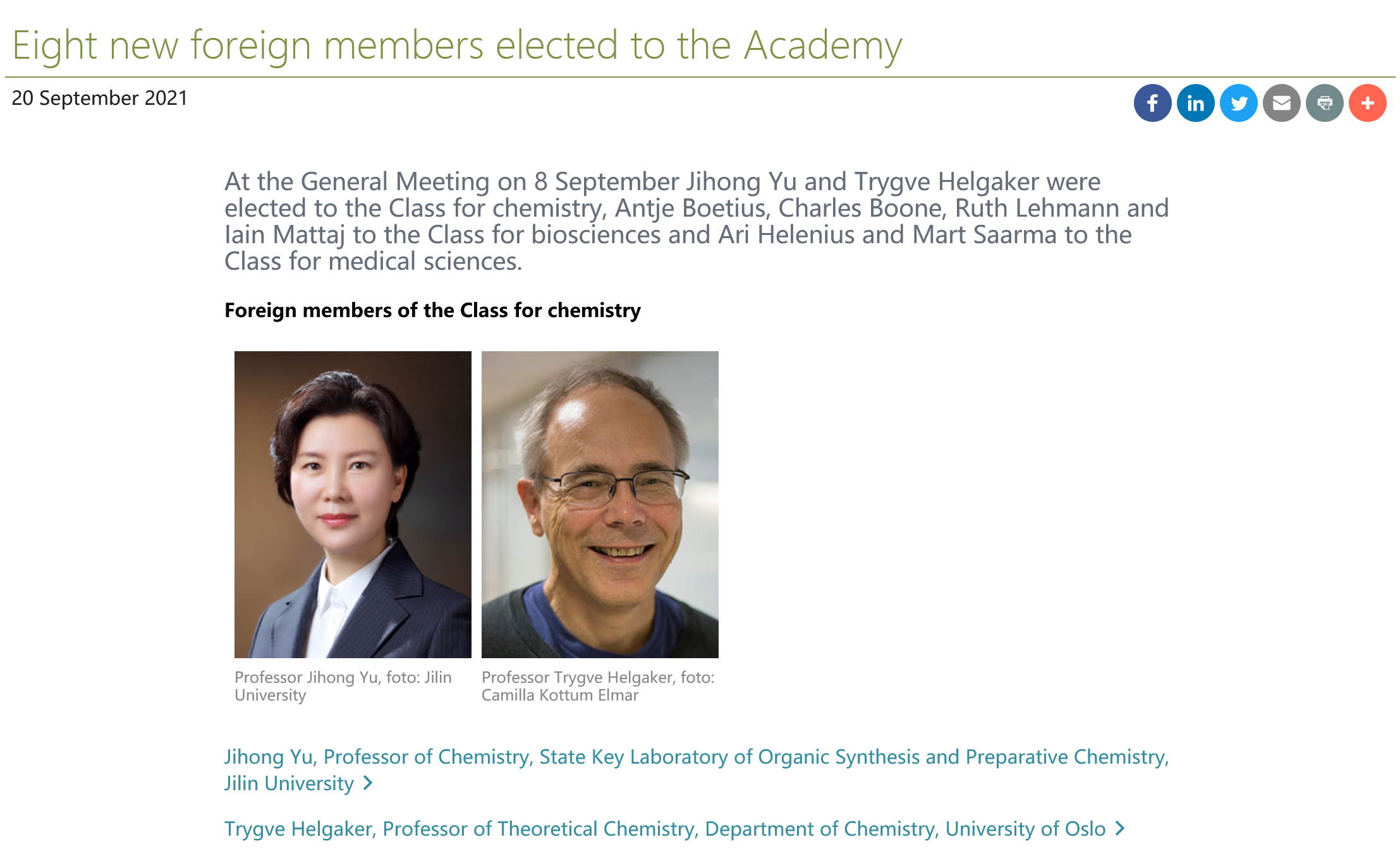 瑞典皇家科学院本次新增8位外籍院士,其中化学学科新增2位。目前,化学学科外籍院士共计16位,于吉红教授是其中唯一一位中国科学家。
