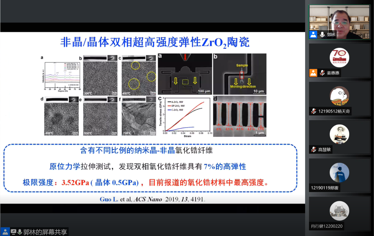 讲座中,郭林教授围绕无机非晶微纳米材料的可控合成及相关特性深入浅出地分享了其课题组在非晶微纳米材料普适制备方法,无机非晶微纳米材料光学特性、催化特性,非晶微纳米材料的力学特性及其在牙修复中的应用等方面的研究进展,展现了无机非晶微纳米材料的研究前沿及广阔的应用前景。在交流互动环节,郭林教授耐心详细地解答了院内外师生的问题,并对相关领域的发展出了展望。草榴社区