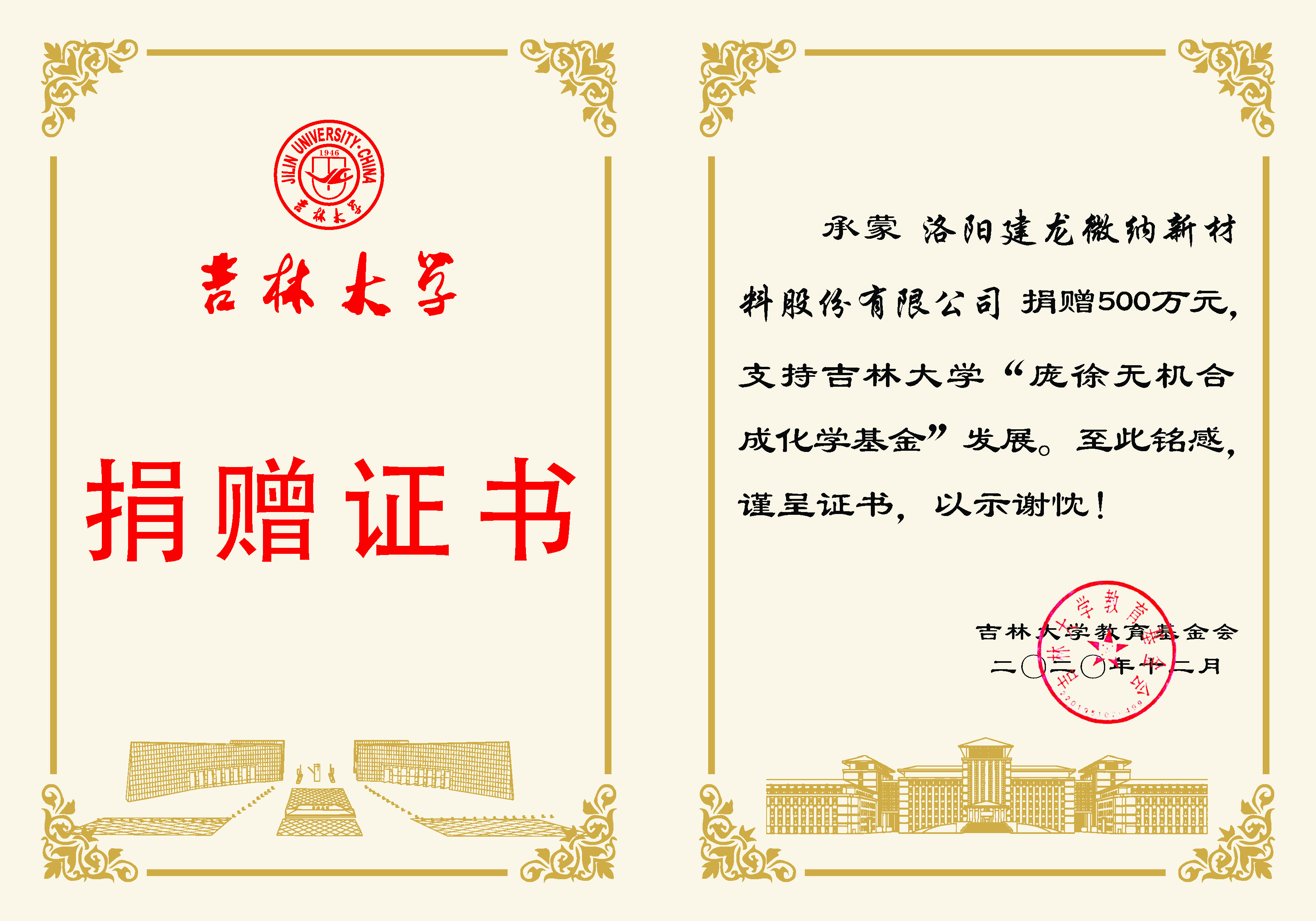 承蒙洛阳建龙微纳新材料股份有限公司捐赠500万元,支持草榴社区 “庞徐无机合成化学基金”发展,至为铭感,谨呈证书,以示谢忱!